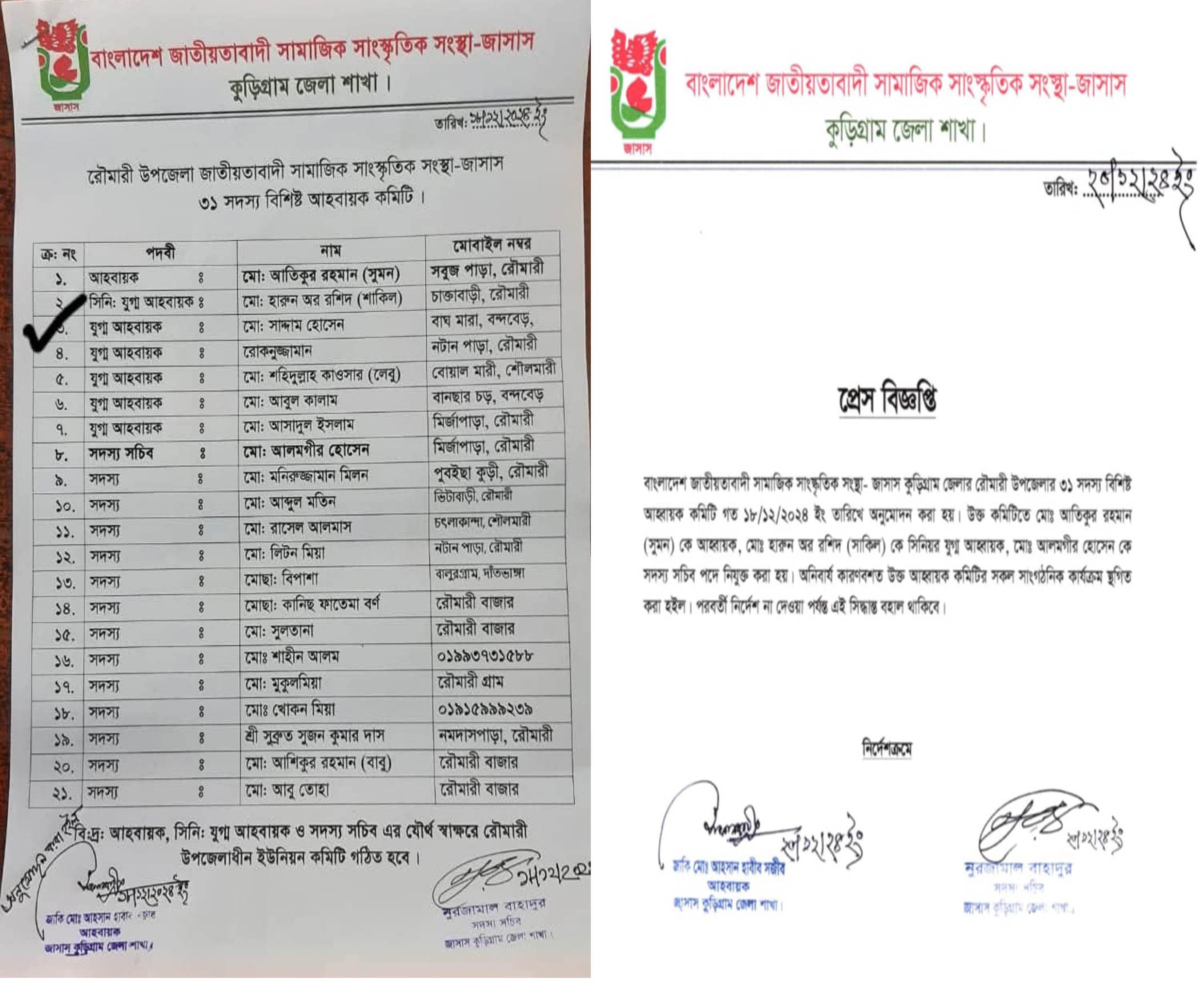 জানা গেছে, বুধবার ১৮ ডিসেম্বর মোঃ আতিকুর রহমান সুমনকে আহবায়ক, হারুন অর রশিদ শাকিল সিনি: যুগ্ম আহবায়ক ও আলমগীর হোসেনকে সদস্য সচিব পদে নিযুক্ত করে জাতীয়তাবাদী সামাজিক সাংস্কৃতিক সংস্থা-জাসাস রৌমারী উপজেলা শাখার ৩১ সদস্যের কমিটি অনুৃমোদন দেয়া হয়। পরে শুক্রবার ২০ ডিসেম্বর কুড়িগ্রাম জেলা জাসাস আহবায়ক জাকি মো: আহসান হাবীব সজীব ও সদস্য সচিব নুরজামাল বাহাদুর এর স্বাক্ষরিত কমিটি অনিবার্য কারণবশত উক্ত কমিটির সকল সাংগঠনিক কার্যক্রম স্থগিত করেন। বলা আছে পরবর্তী নির্দেশনা না দেওয়া পর্যন্ত এই সিদ্ধান্ত বহাল থাকবে। উল্লেখ যে, অনুমোদিত কমিটি কত দিনের জন্য থাকবে তা কোনো মেয়াদ উল্লেখ করা হয়নি।