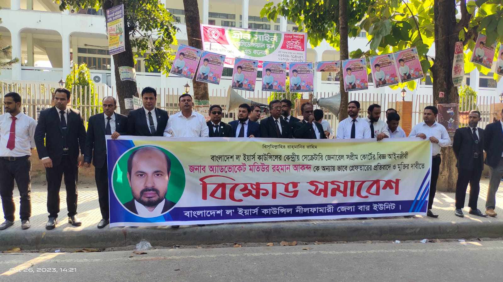 মোঃ মাসুদ রানা, স্টাফ রিপোর্টার: ঢাকা উত্তরার বাসা থেকে বাংলাদেশ ল ইয়ার্স ইয়ার্স কাউন্সিলের কেন্দ্রীয় সেক্রেটারি জেনারেল সুপ্রিম কোর্টের বিজ্ঞ আইনজীবী অ্যাডভোকেট মতিউর রহমান আকন্দকে গ্রেফতারের প্রতিবাদ ও মুক্তির দাবীতে বিক্ষোভ সমাবেশ করেছে বাংলাদেশ ল ইয়ার্স ইয়ার্স কাউন্সিল নীলফামারী জেলা বার ইউনিট।