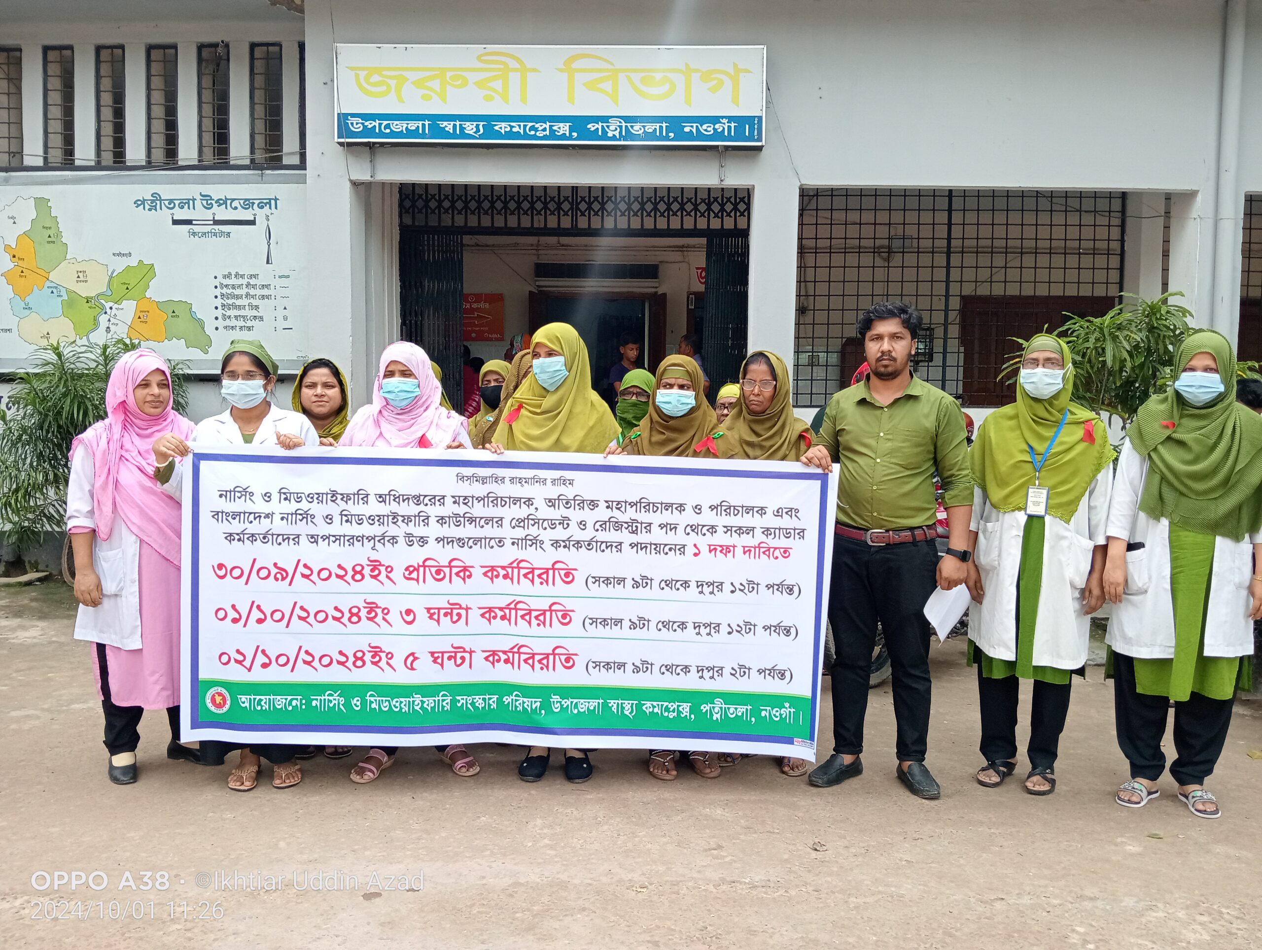 এক দফা দাবিতে নওগাঁর পত্নীতলায় হাসপাতালের কর্মবিরতিতে যাচ্ছেন নার্স ও মিডওয়াইফরা। বাংলাদেশ নার্সিং মিডওয়াইফারি কাউন্সিল থেকে সব ক্যাডার প্রত্যাহার করে যোগ্য ও অভিজ্ঞদের পদায়নের দাবিতে তিন ঘণ্টার কর্মবিরতি শুরু করেন তাঁরা।