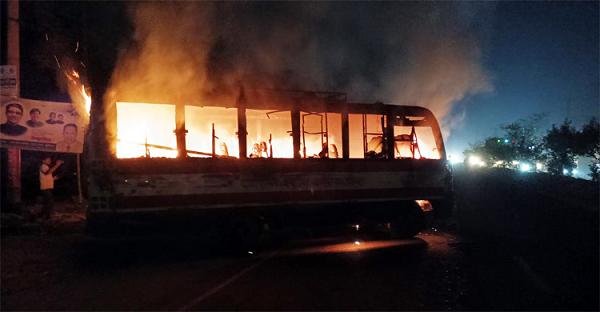 রাজধানীর যাত্রাবাড়ী থানার সামনে একটি যাত্রীবাহী বাসে আগুন দিয়েছে দুর্বৃত্তরা। রোববার (১৯ নভেম্বর) রাত ৯ টা ৫৭ মিনিটে এ ঘটনা ঘটে। আগুন নির্বাপণে ফায়ার সার্ভিসের দুটি ইউনিট কাজ করে।