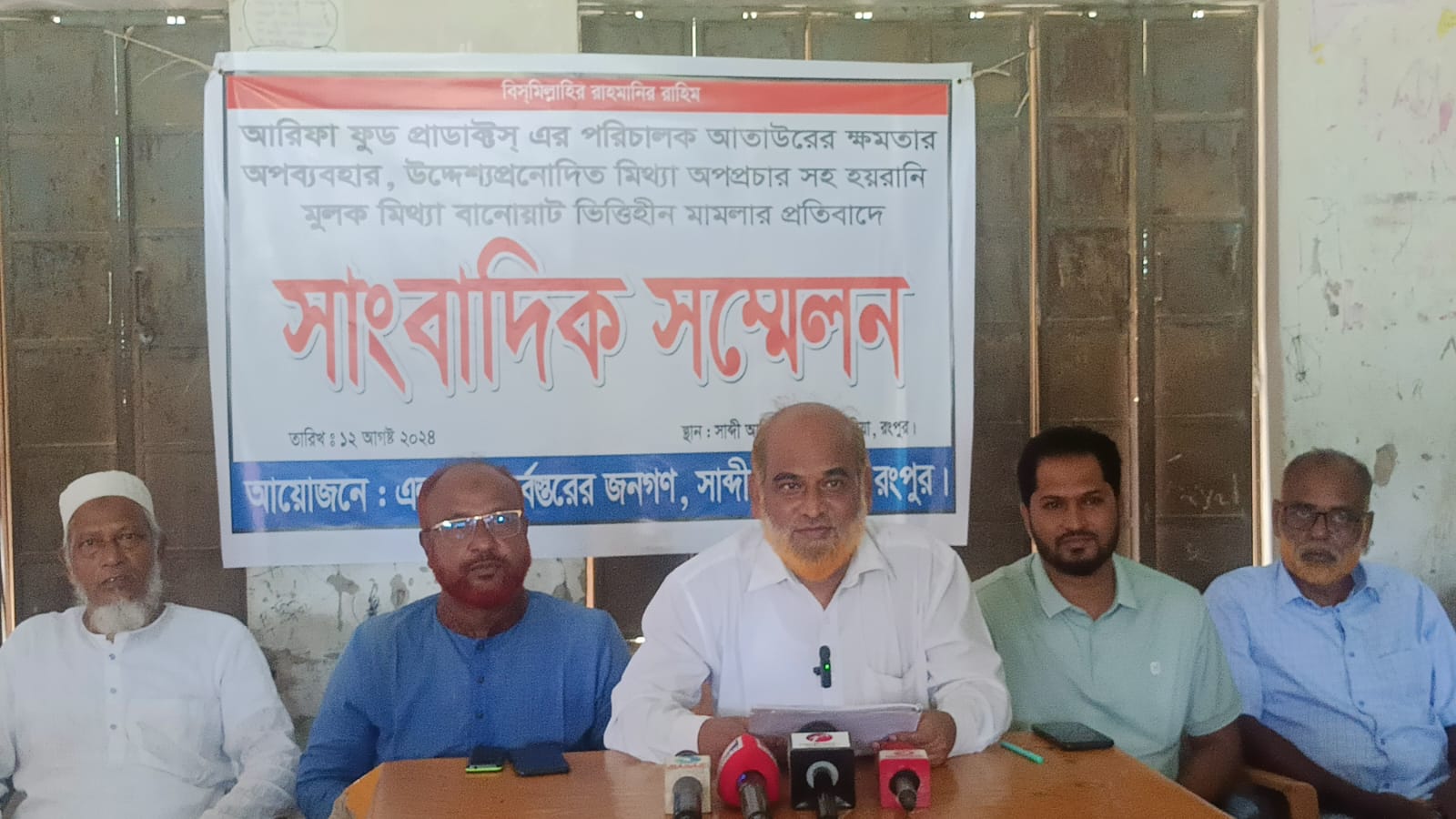 কাউনিয়ায় আরিফা ফুড প্রোডাক্টেসের ব্যবস্থাপনা পরিচালকের বিরুদ্ধে সোমবার দুপুরে সাব্দী দারুসছুন্নাহ আলিম মাদ্রাসা হল রুমে সাংবাদিক সন্মেলন করেছে এলাকার বাসীর পক্ষে উপজেলা বিএনপির সদস্য সচিব এ্যাডভোকেট মোজাহারুল আলম বাবলু। তিনি লিখিত বক্তব্যে বলেন আরিফা ফুড প্রোডাক্টাসের ব্যবস্থাপনা পরিচালক মোঃ আতাউর রহমান আওয়ামী লীগের ক্ষমতার দাফট দেখিয়ে সাব্দী এলাকার মানুষের জমি দখল,নিরীহ মানুষের নামে হয়রানিমূলক মামলা,হামলা সহ নানা ভাবে হয়রানি চালিয়ে আসছে। এছাড়াও তার আরিফা ফুড প্রোডাক্ট সরকারী ট্যাক্স ফাঁকি ও কোম্পানিতে ভেজাল শিশু খাদ্য উৎপাদন ও বাজারজাত করে সাধারণ ভোক্তাদের সাথে প্রতারণা করছে। তিনি ইতিমধ্যে ১০ টি পরিবারের অর্ধশতাধিক ব্যাক্তির নামে হয়রানি মূলক মামলা করে সর্বশান্ত করেছে। এছাড়াও কোম্পানির শ্রমিকদের ন্যায্য বেতন ভাতা ও বিভিন্ন সুযোগ সুবিধা থেকে বঞ্চিত করে রেখেছে। কেউ এ বিষয়ে প্রতিবাদ করলে তাকে চাকুরী হারানো সহ মানুষিক নির্যাতনের শিকার হতে হয়েছে।