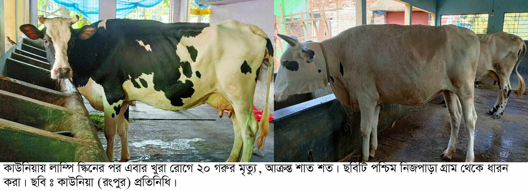 রংপুরের কাউনিয়ায় লাম্পি স্কিন রোগের পর হঠাৎ করে দেখা দিয়েছে গরুর ক্ষুরা রোগ। এই রোগে আক্রান্ত হয়ে ৬ইউনিয়নে এখন পর্যন্ত প্রায় ২০টি গরু মারা যাওয়ার খবর পাওয়া গেছে। এছাড়া অসুস্থ হয়ে পড়ছে আক্রান্ত এলাকার বেশির ভাগ গবাদি পশু। এতে আতঙ্কিত হয়ে পড়েছেন খামারি ও কৃষকরা।