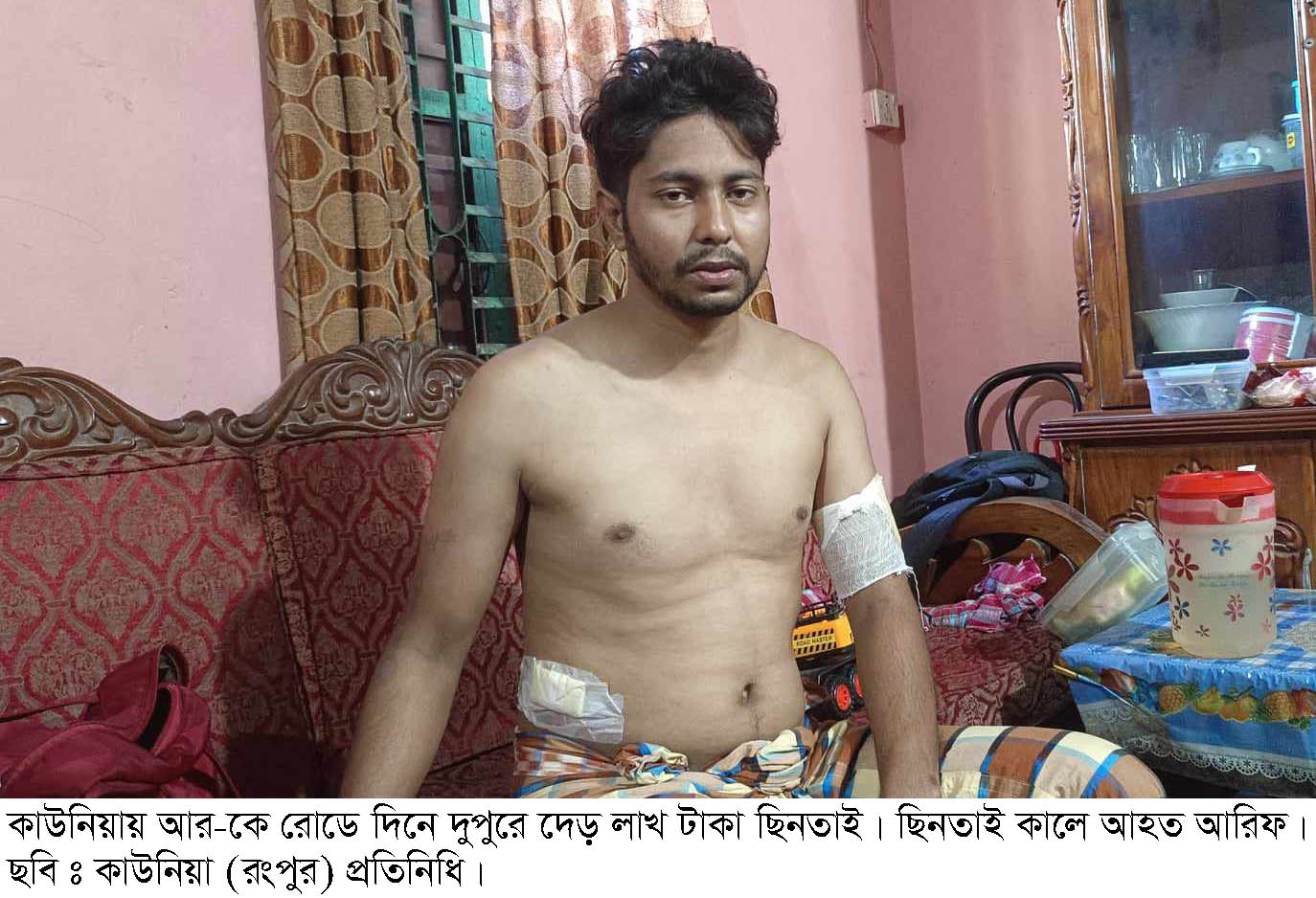 আহত আরিফ কাউনিয়া উপজেলার এ্যালাইড ফ্যাক্টরির আইটি অফিসার এবং সাহাবাজ গ্রামের আব্দুল মান্নানের পুত্র। আহত আরিফের সাথে কথা বলে জানা যায়, গত ২৬ নভেম্বর বুধবার দুপুর আনুমানিক আড়াইটায় আরিফ সোহেলের ভাটা থেকে অফিসের পাওনা দেড় লাখ টাকা নিয়ে মোটরসাইকেল যোগে কাউনিয়ার উদ্দেশ্যে রওনা হয়। পথিমধ্যে মেনাজের চাতালের নিকট পৌঁছলে মোটরসাইকেল আরোহী তিনজন তার গতিরোধ করে গলায় ছুরি ধরে। ধস্তাধস্তির এক পর্যায়ে আরিফের পেটে ও হাতে ছুরি মেরে আহত করে ছিনতাইকারীরা গেঞ্জির ভিতরে থাকা দেড় লাখ টাকা নিয়ে তাকে রাস্তায় ফেলে দিয়ে রংপুরে দিকে চলে যায়। পরে আরিফের চিৎকারে স্থানীয়রা ছুটে এসে তাকে উদ্ধার করে কাউনিয়া মেডিকেলে ভর্তি করে। এ ব্যাপারে কাউনিয় থানার অফিসার ইনচার্জ এসএম শরিফ জানান অভিযোগ পেলে ব্যবস্থা গ্রহন করা হবে।