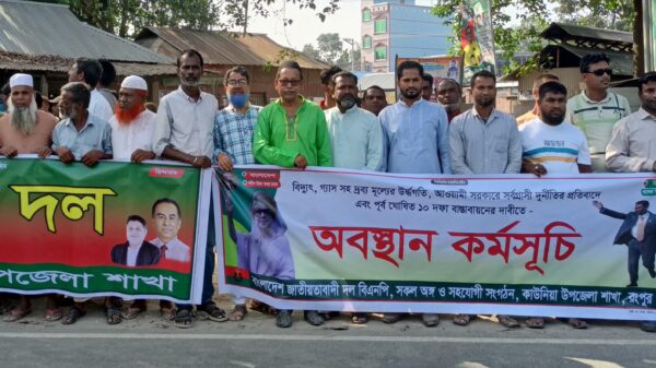 জহির রায়হান বিদ্যুৎ,গ্যাস সহ দ্রব্যমূল্যের উর্দ্ধগতি, আওয়ামী সরকারের সর্বগ্রাসী দূর্নীতির প্রতিবাদে এবং পূর্বঘোষিত ১০ দফা বাস্তবায়নের দাবীতে কাউনিয়া উপজেলা বিএনপি ও অঙ্গ সংগঠন শনিবার বিকালে গালর্স স্কুল মোড়ে দলীয় কার্যালয়ের সামনর অবস্থান কর্মসূচী পালন করে। এসময় উপস্থিত ছিলেন উপজেলা বিএনপির যুগ্ম আহবায়ক মোঃ রকিবুল হাসান পলাশ, যুগ্ন আহবায়ক আব্দুর রহিম মোঃ জামিনুর রহমান, আলমগীর চৌধুরী লিটন, আকতারুজ্জামান মন্ডল, আমজাদ হোসেন, সোহেল রানা,আতিকুল ইসলাম সোহাগ, সদস্য সচিব এ্যাডঃ মোঃ মোজাহারুল ইসলাম বাবলু, আহবায়ক কমিটির সদস্য ও উপজেলা বিএনপির সাবেক সাধারণ সম্পাদক মোঃ শফিকুল আলম শফি, বালাপাড়া ইউনিয়ন বিএনপির সাবেক সাধারণ সম্পাদক মোঃ শাজাহান আলী,স্বেচ্ছাসেবক দলের নেতা বাবলু সরকার বাবলু প্রমূখ।