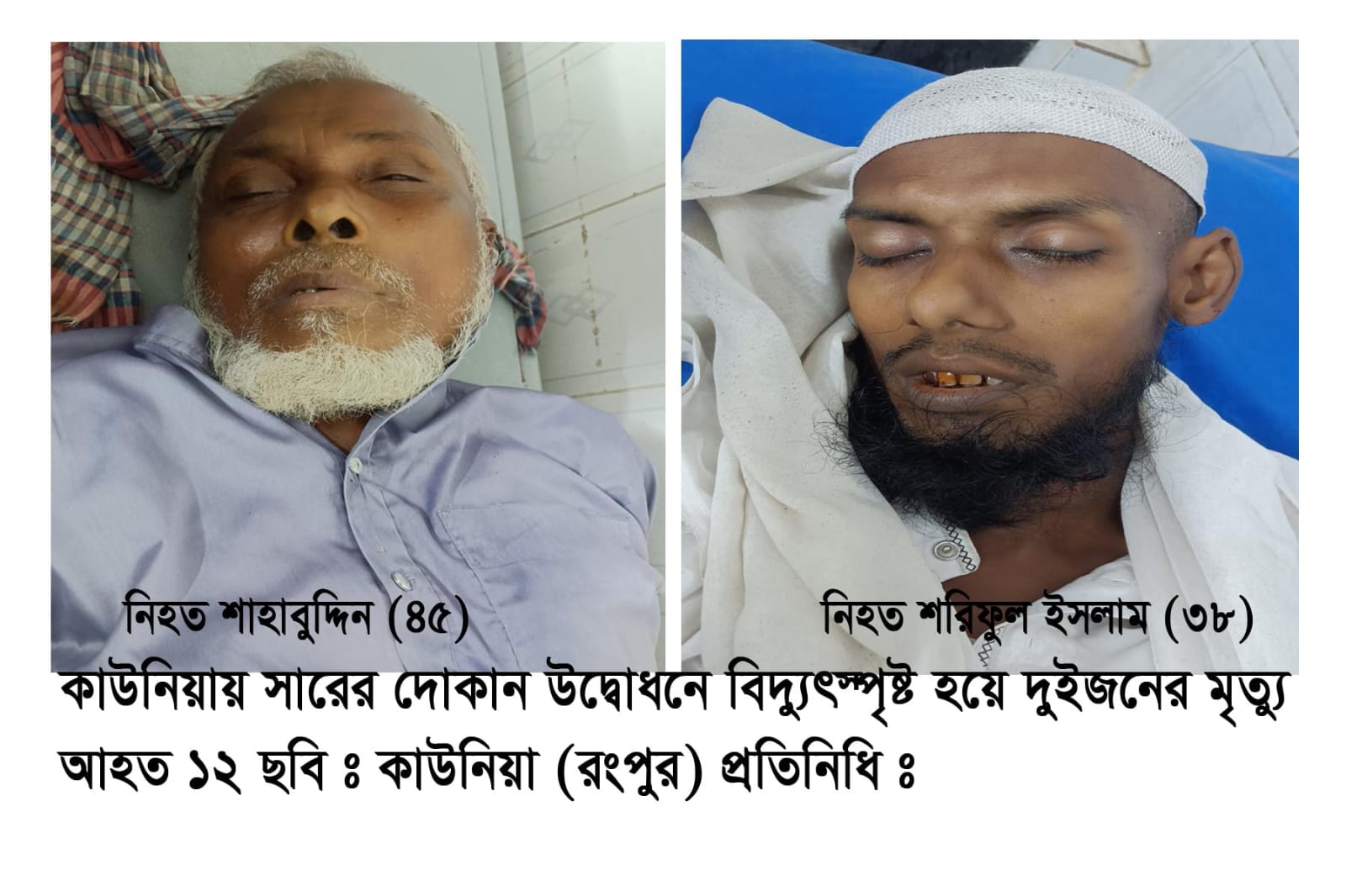 কাউনিয়ায় নতুন একটি রাসায়নিক সারের দোকানের উদ্বোধনী অনুষ্ঠানের মাইকের কাঁচা বাঁশ বিদ্যুতের তারে পরে বিদ্যুৎস্পৃষ্ট হয়ে ২জনের মৃত্যু ঘটেছে এবং ১২ জন আহত হয়েছেন। আহতদের ৩জন কে উপজেলা স্বাস্থ্য কেন্দ্রে ও ২জনকে রংপুর মেডিকেল কলেজ হাসপাতালে ভর্তি করা হয়েছে। ঘটনা টি ঘটেছে রোববার রাত আনুমানিক সাড়ে ৮টার দিকে উপজেলার সাহবাজ গ্রামের আমতলা নামক স্থানে।