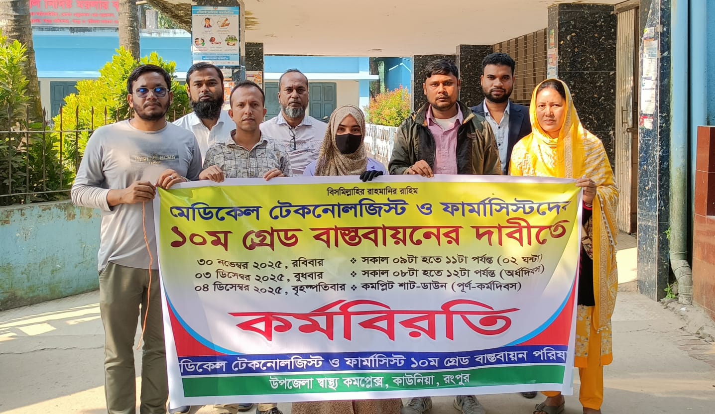 কাউনিয়ায় মেডিকেল টেকনোলজিস্ট ও ফার্মাসিস্টরা ১০ম গ্রেড প্রদানসহ ৪ দফা দাবিতে অনির্দিষ্টকালের জন্য কর্মবিরতি শুরু করেছেন। রবিবার সকাল ৯টা থেকে ১১টা পর্যন্ত উপজেলা স্বাস্থ্য কমপ্লেক্স প্রাঙ্গণে প্রথম দিনের কর্মবিরতি পালন করা হয়।