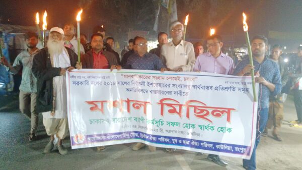 নির্বাচনী ইশতেহারের সংখ্যালঘু স্বার্থবান্ধব প্রতিশ্রুতিসমূহ অনতিবিলম্বে বাস্তবায়নের দাবীতে রংপুরের কাউনিয়ায় মশাল মিছিল করেছে বাংলাদেশ হিন্দু বৌদ্ধ খ্রিস্টান ঐক্য পরিষদ। শুক্রবার (২৪ ফেব্রুয়ারী) সন্ধ্যা সাড়ে ৭টায় সারাদেশের ন্যায় উপজেলা শাখা এ কর্মসূচি আয়োজন করে।