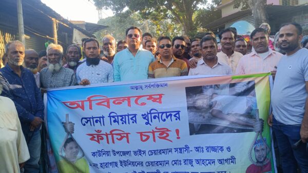 কাউনিয়ার হারাগাছে আওয়ামী লীগের দুই পক্ষের সংঘর্ষে ২৪ এপ্রিল নিহত হারাগাছ ইউনিয়ন আওয়ামী লীগের কর্মী সোনা মিয়ার হত্যাকারীদের বিচারের দাবীতে শনিবার বিকালে বাংলাদেশ আওয়ামী লীগ টেপামধুপুর ইউনিয়ন শাখা ও অঙ্গ সংগঠনের উদ্যোগে টেপামধুপুর বালিকা বিদ্যালয় ও মহাবিদ্যালয় মাঠ থেকে একটি বিক্ষোভ মিছিল বের করে বিভিন্ন সড়ক প্রদক্ষিণ করে ফিরে এসে মহাবিদ্যালয় মাঠে এক সংক্ষিপ্ত সভায় মিলিত হয়। এসময় বক্তব্য রাখেন রংপুর জেলা পরিষদের প্যানেল চেয়ারম্যান মোঃ আলতাব হোসেন,টেপামধুপুর ইউনিয়নের সাবেক চেয়ারম্যান শফিকুল ইসলাম শফি, টেপামধুপুর ইউনিয়ন আওয়ামী লীগ নেতা মামুনুর রশীদ চাঁন মিয়া, আওয়ামী লীগ নেতা মেনাজ উদ্দিন যুবলীগ নেতা শাহীন মাহমুদ,উপজেলা ছাত্র লীগের আহবায়ক হোমায়রা ইসলাম চাঁদনী, যুগ্ন আহবায়ক জামিল হোসাইন,উপজেলা ছাত্র লীগের সাবেক সাধারণ সম্পাদক আশিকুর রহমান আশিক ছাত্রলীগ নেতা সোহেল রানা প্রমুখ। বিক্ষোভ মিছিল থেকে খুনিদের ফাঁসি চাই ফাঁসি চাই শ্লোগানে মুখরিত করে তোলা হয়।