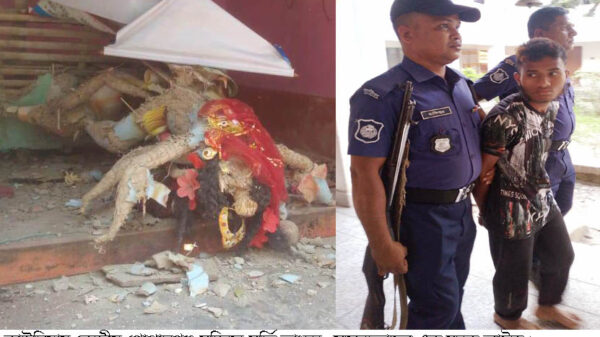 জহির রায়হান কাউনিয়া (রংপুর) প্রতিনিধিঃ- রংপুরের কাউনিয়া উপজেলার বালাপাড়া ইউনিয়নের গোপালগঞ্জ কেন্দ্রীয় দূর্গা মন্দিরে মূর্তি ভাংচুরের ঘটনা ঘটেছে। এঘটনায় সন্দেহে ভাজন এক যুবক আটক করেছে পুলিশ। গোপালগঞ্জ কেন্দ্রীয় মন্দিরের সাধারণ সম্পাদক বিপ্লব গোস্বামী জানান, গত শুক্রবার রাতে পুজা অর্চণা শেষে হিন্দু সম্প্রদায়ের লোকজন মন্দিরে তালা লাগিয়ে চলে যায়। শনিবার ভোরে স্থানীয় একজন মহিলা মন্দিরে পূজা দিতে এসে দেখতে পান মন্দিরে কালী প্রতিমা রাখার ঘরে কালী মুর্তিকে কে বা কারা টেনে মাটিতে ফেলে ভাংচুর করেছে। এসময় পাশে রাখা একটি হুনুমান মূর্তিও ভাংচুর করেছে। খবর পেয়ে জেলা প্রশাসক রংপুর ড. চিত্র লেখা নাজনীন, পুলিশ সুপার ফেরদৌস আলী চৌধুরী, অতিরিক্ত পুলিশ সুপার কামরুজ্জামান, রাজিয়া সুলতানা, কাউনিয়া উপজেলা নির্বাহী কর্মকর্তা (অতিরিক্ত দায়িত্ব ) মনোনীতা দাস,বীর মুক্তিযোদ্ধা কোম্পানী কমান্ডার সরদার আব্দুল হাকিম,কাউনিয়া থানা অফিসার ইনচার্জ ওসি মোন্তাছের বিল্লাহ ঘটনা স্থল পরিদর্শন করেন। এসময় থানা অফিসার ইনচার্জ মোন্তাছের বিল্লাহ জানান মুর্তি ভাংচুরের ঘটনার সাথে জড়িত সন্দেহে এক যুবক আটক করা হয়েছে। আটককৃত যুবক কুড়িগ্রাম সদর উপজেলার রায়পুর আরডিআরএস এলাকার নজরুল ইসলামের পুত্র মোঃ জাকির হোসেন (১৯)। এ ঘটনার সাথে আরো কেউ জড়িত আছে কি না সেটা গুরুত্বসহকারে তদন্ত করা হচ্ছে। আটককৃত যুবক কে জিজ্ঞাসা শেষে আদালতে সোপর্দ করা হবে। এর আগে শহীদবাগ ইউনিয়নে মূর্তি ভাংচুরের ঘটনা ঘটে ছিল। এঘটনায় হিন্দু সম্প্রদায়ের লোকজন দ্রুত বিচার দাবী করেছেন।