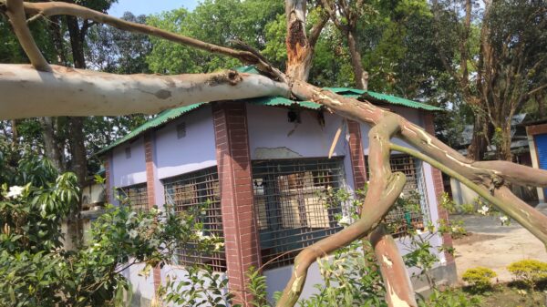 সরেজমিনে উপজেলা ভূমি অফিসে গিয়ে দেখা গেছে, ২০১৭ সালের ১৭জুলাই তৎকালিন উপজেলা নির্বাহী অফিসার দীপঙ্কর রায় এর পরিকল্পনায় উপজেলা পরিষদের অর্থায়নে সেবা গ্রহীতাদের জন্য হেল্প ডেক্স মাটির পরশ নামে নান্দনিক ঘরটি নির্মান করা হয়। সেই মাটির পরশ ঘরটির উপর গত সাত দিন আগে হঠাৎ ঝড়ে জনস্বাস্থ্য প্রকৌশল দপ্তরের একটি ইউক্লিপটাস গাছের ডাল পড়ে লন্ড ভন্ড হয়ে গেলেও গাছটি সরানোর কোন ব্যবস্থা করা হচ্ছে না। অনুসন্ধানে জানাগেছে জনস্বাস্থ্য প্রকৌশল দপ্তরের ৩টি গাছ উন্মুক্ত ডাকের মাধ্যমে ৩বার বিক্রির ব্যবস্থা করা হলেও অজ্ঞাত কারনে তা বিক্রি করা হয়নি। সেই গাছ গুলোর মধ্যে ঝুকি পূর্ন গাছ ছিল একটি, সেই গাছ পড়ে এতো টাকা ব্যায়ে নান্দনিক সেবা গ্রহীতাদের জন্য হেল্প ডেক্স মাটির পরশ ঘরটি নষ্ট হলেও এটি সরাতে কর্তৃপক্ষের কোন উদ্যোগ নেই। গত রবিবার ভূমি অফিসে সেবা নিতে আসা আঃ রাজ্জাক জানান, গাছটি পড়ে ঘরটির ব্যাপক ক্ষতি হয়েছে, ঘরটি অনেক সুন্দর ছিল কিন্তু কর্তুপক্ষের গাফিলতির কারনে এতো বড় ক্ষতি হয়ে গেল। সেই সময়ে উন্মুক্ত নিলামে গাছ ক্রয় করতে আসা শফিকুল ইসলাম জানান, গাছগুলো বাজার মূল্যেও চেয়ে সরকারী মূল্য বেশী ও গাছটি ঝুকি পূর্ন হওয়ায় কাটতে গিয়ে সরকারী সম্পদ নষ্ট হওয়ার ঝুকি থাকায় এতো দামে কেউ কিনতে চায়নি। এব্যাপারে উপজেলা প্রকৌশলী আসাদুজ্জামান জেমি জানান, গাছের মূল্য নির্ধারনের কাজ বন বিভাগের, এখানে আমার কিছু করার নাই। বন বিভাগকে গাছের মূল্য পূনঃনির্ধারনের জন্য বলা হলেও তা এখনও পাই নি। সেই সময় গাছগুলো বিক্রয় হলে হয়তো এতা বড় ক্ষতি হতো না। পড়ে যাওয়া গাছ সরানোর ব্যবস্থা করা হবে। নির্বাহী অফিসার (অতিরিক্ত দায়িত্ব) মনোনিতা দাস জানান, গাছ পড়ে মাটির পরশ ঘরটির ক্ষতির বিষয়টি জনস্বাস্থ্য প্রকৌশল দপ্তর কে জানিয়েছি, তারা ব্যবস্থা নেয়ার কথা। আর গাছ কাটা লেবার না পাওয়ার কারনে গাছটি সরান সম্ভব হয়নি। আশা করছি দ্রæত সরানোর ব্যবস্থা করা হবে। বন বিভাগসহ সংশ্লিষ্ট কর্তৃপক্ষের সিদ্ধান্তে অভাবে সরকারের এতো বড় ক্ষতি হলো এ দায় কার ? জনগন জানতে চায়।
