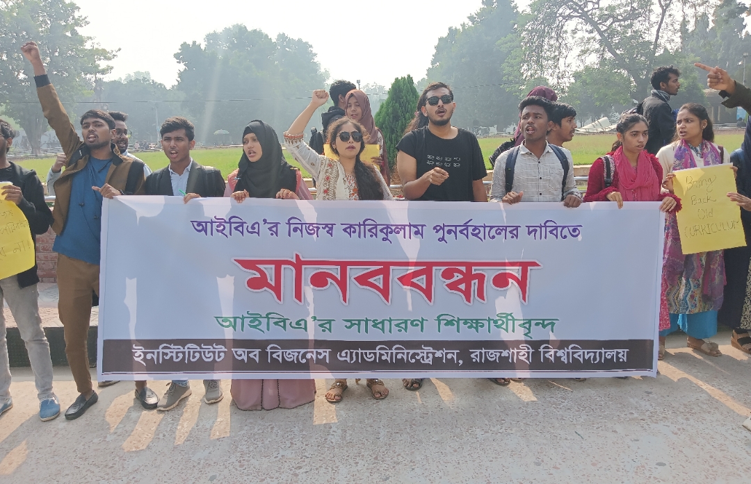 পুরাতন কারিকুলাম পুনর্বহালেত দাবিতে মানববন্ধন করেছে রাজশাহী বিশ্ববিদ্যালয়ের (রাবি)আইবিএর সাধারণ শিক্ষার্থীরা।সোমবার(১৮ ডিসেম্বর) সকাল সাড়ে দশটার দিকে আইবিএ ভবনের সামনে থেকে শুরু হয়ে প্রশাসনিক ভবন পর্যন্ত তাদের এই মানববন্ধন কর্মসূচি চলে ।