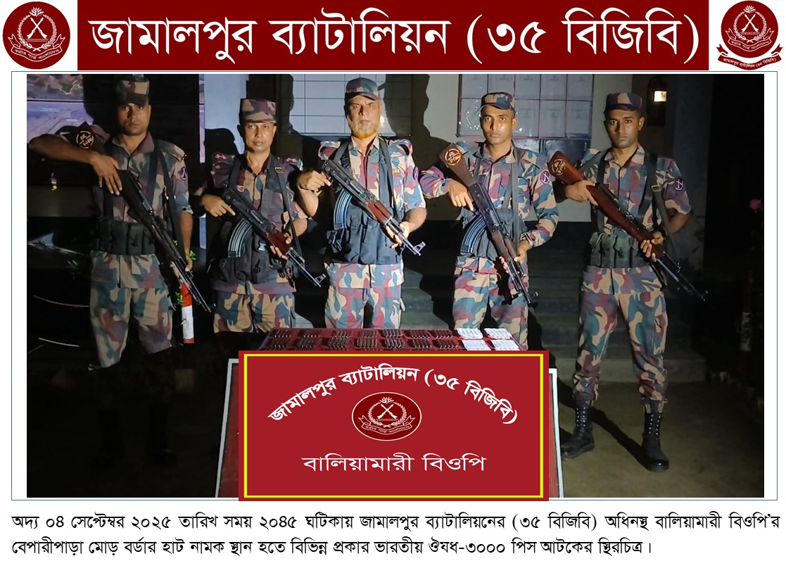 জামালপুর ব্যাটালিয়নের (৩৫-বিজিবি) সহকারী পরিচালক (ভারপ্রাপ্ত এ্যাডজুটেন্ট) মোঃ ইমাম হোসেন। এক সংবাদ বিজ্ঞপ্তির মাধ্যমে এ তথ্য জানানো হয়।