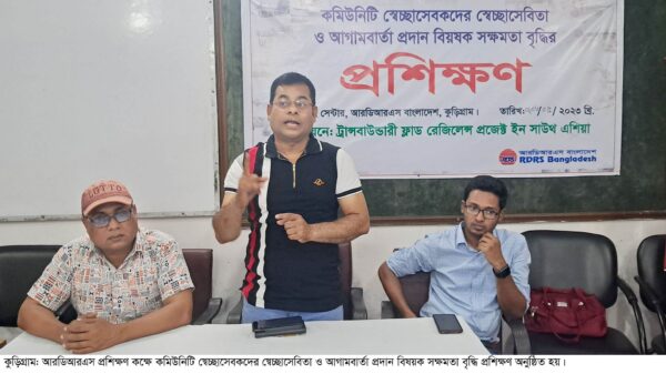 কুড়িগ্রামে বন্যার আগামবার্তা বিষয়ক স্বেচ্ছাসেবকদের নিয়ে দুইদিনব্যাপী প্রশিক্ষণ শুরু হয়েছে। বুধবার সকালে আরডিআরএস বাংলাদেশ কুড়িগ্রাম প্রশিক্ষণ কেন্দ্রে ট্রান্সবাউন্ডারী ফ্লাড রেজিলেন্স ইন সাউথ এশিয়া প্রকল্পের উদ্যোগে ৩০জন যুব ও যুবতী প্রশিক্ষণে অংশগ্রহন করে।