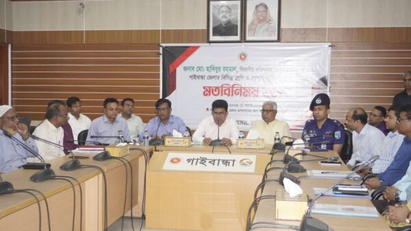 গাইবান্ধায় বিভিন্ন শ্রেণী ও পেশার ব্যাক্তিবর্গে সাথে এক মতবিনিময় সভা করেছেন রংপুর বিভাগীয় কমিশনার মো. হাবিবুর রহমান। ১৭ মে বুধবার দুপুরে জেলা প্রশাসনের আয়োজনে জেলা প্রশাসক সম্মেলন কক্ষে মতবিনিময় সভায় প্রধান অতিথি হিসাবে বক্তব্য রাখেন তিনি । এ মতবিনিময় সভায় জেলার বিভিন্ন সমস্যা ও সম্ভাবনা নিয়ে আলোচনা করেন বক্তাগণ। গাইবান্ধা জেলাকে কিভাবে এগিয়ে নেয়া যায় সেই বিষয়ে বিভিন্ন শ্রেণী পেশার ব্যাক্তির মতামত প্রদান করেন। এ মতামতের ভিত্তিতে আগামীতে গাইবান্ধা জেলার উন্নয়নে বেশ কিছু সুপারিশ উঠে আসে। জেলা প্রশাসক মো. অলিউর রহমানের সভাপতিত্বে এ মতবিনিময় সভায় বক্তব্য রাখেন জেলা পরিষদের চেয়ারম্যান ও জেলা আওয়ামীলীগের সভাপতি আবু বকর সিদ্দিক, গাইবান্ধা প্রেসক্লাব এর সভাপতি কে.এম রেজাউল হক, ভারপ্রাপ্ত সাধারন সম্পাদক আবেদুর রহমান স্বপন সহ অন্যান্যরা। এছাড়াও সরকারি বেসরকারি প্রতিষ্ঠানের বিভিন্ন দপ্তরের কর্মকর্তা, জনপ্রতিনিধি, সাংস্কৃতিক ব্যাক্তিত্ব, এনজিও কর্মী, সাংবাদিকরা এই মতবিনিময় সভায় উপস্থিত ছিলেন।