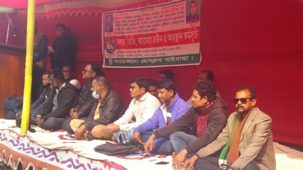 আজ রবিবার সকাল ১১ টায় শহরের গোরস্থান মোড়ে প্রেসক্লাব গাইবান্ধা কার্যালয়ের সামনে তিনঘন্টা ব্যাপি এই অবস্থান কর্মসূচি পালন করা হয়। প্রেসক্লাব গাইবান্ধার সভাপতি খালেদ হোসেনের সভাপতিত্বে ও সাধারণ সম্পাদক জাভেদ হোসেনের সার্বিক পরিচালনায় চলমান প্রতিবাদ কর্মসূচিতে গাইবান্ধার পলাশবাড়ী, গোবিন্দগঞ্জ ও ফুলছড়ি উপজেলার প্রেসক্লাবসহ বেশ কয়েকটি প্রেসক্লাবের সাংবাদিক নেতৃবৃন্দরাসহ দেড় শতাধিক সাংবাদিকরা উপস্থিত ছিলেন। এরআগে হয়রানিমূলক এই মিথ্যা মামলা দায়েরের প্রতিবাদে গত রোববার (৮জানুয়ারি) সন্ধ্যায় প্রেসক্লাব গাইবান্ধায় এক জরুরী বৈঠকে এই কলম বিরতি, ক্যামেরা ডাউন ও অবস্থান কর্মসূচি সিদ্ধান্ত নেওয়া হয়। এছাড়া বৈঠকের সিদ্ধান্ত মোতাবেক গত (১০ জানুয়ারি) জেলা শহরে মানববন্ধন কর্মসূচি পালন ও (১২ জানুয়ারি) বিভাগীয় কমিশনারের কাছে স্বারকলিপি প্রদান করা হয়েছে।