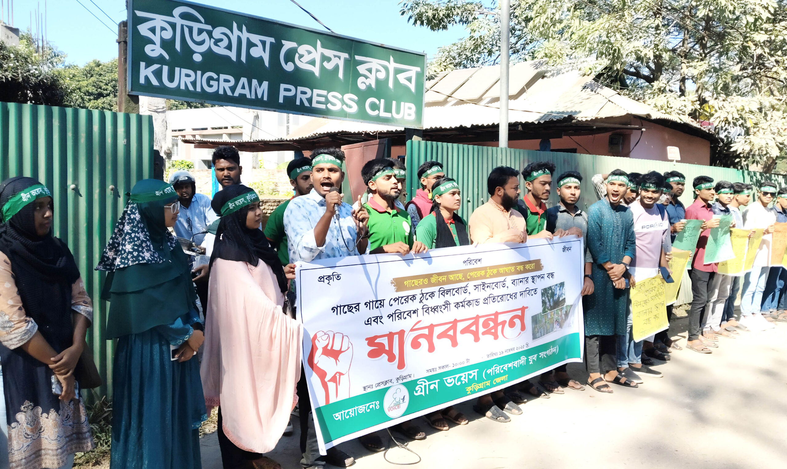 গাছেরও জীবন আছে, পেরেক ঠুকে আঘাত বন্ধ করুন” এই স্লোগান তুলে মানববন্ধনে বক্তারা পরিবেশ সচেতনতা বৃদ্ধি এবং রাজনৈতিক ব্যক্তি, ডাক্তার, ক্লিনিক, ডায়াগনস্টিক, কোচিং ও স্কুল-কলেজসহ বিভিন্ন প্রতিষ্ঠানের দৃষ্টি আকর্ষণ করে গাছে সাইনবোর্ড, ফেস্টুন ঝুলানো বন্ধকরণ এবং অবিলম্বে সেগুলো সরিয়ে নেওয়ার দাবীতে মানববন্ধন অনুষ্ঠিত হয়েছে। বুধবার ১৯ নভেম্বর সকালে কুড়িগ্রাম প্রেসক্লাবের সামনে পরিবেশবাদী যুব সংগঠন গ্রীন ভয়েস একটি মানববন্ধন করে।