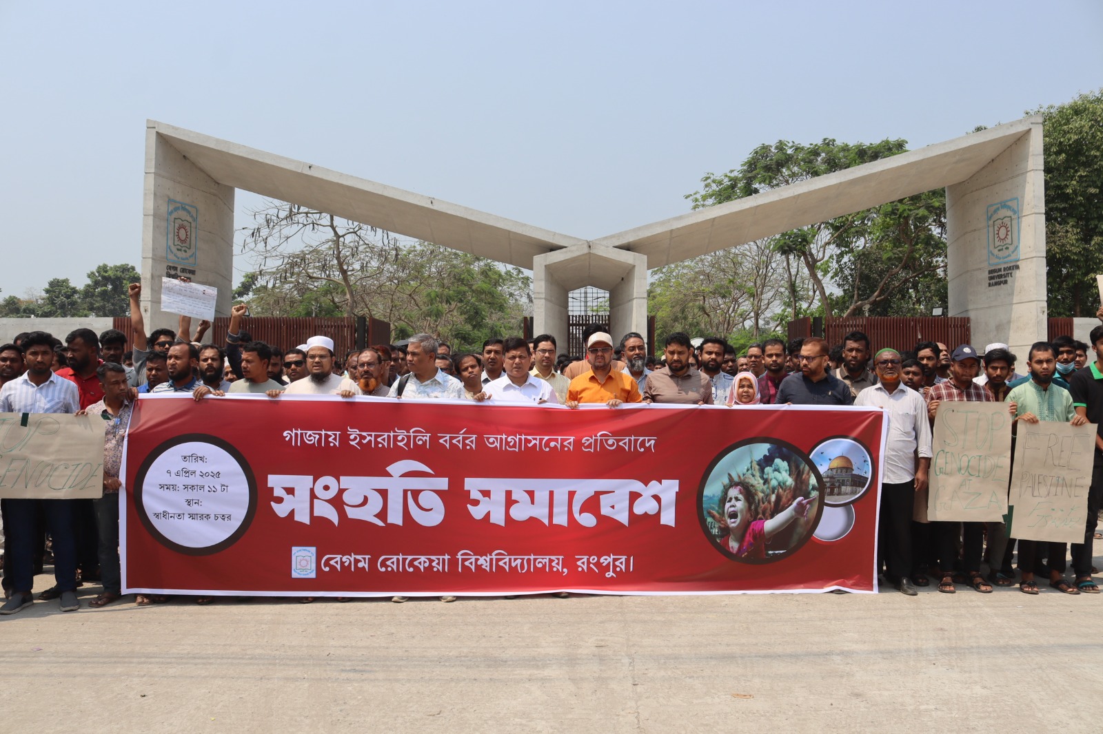 বিশ্ববিদ্যালয়ের বিভিন্ন বিভাগের শিক্ষক, শিক্ষার্থী, কর্মকর্তা ও কর্মচারী উক্ত সংহতি সমাবেশে অংশগ্রহণ করেন। সমাবেশে প্রধান অতিথি হিসেবে বক্তব্য রাখেন বেরোবি উপাচার্য। এ সময় তিনি বলেন, ফিলিস্তিনের গাজায় ইসরাইলের বর্বরোচিত ও ন্যাক্কারজনক হামলার প্রতিবাদে বাংলাদেশসহ সারাবিশ্বের বিক্ষুব্ধ মানুষের সাথে একাত্মতা প্রকাশ করে বেগম রোকেয়া বিশ্ববিদ্যালয়ে সংহতি সমাবেশ অনুষ্ঠিত হচ্ছে। তিনি আরও বলেন. ফিলিস্তিনের নিরীহ জনগণের উপর ইসরাইলের নির্বিচারে হত্যা ও তাদের ঘরবাড়ি স্থাপনায় হামলার নৃশংসতা সারা বিশ্বের মানুষ দেখছে। ইসরাইলি বাহিনীর ইতিহাসের জঘন্যতম মানবতাবিরোধী অপরাধের বিরুদ্ধে শক্ত জনমত গড়ে তোলা এবং অবিলম্বে হামলা বন্ধ করে নিরীহ ফিলিস্তিনের পাশে বিশ্ব সম্প্রদায়কে এগিয়ে আসার আহ্বান জানান উপাচার্য।