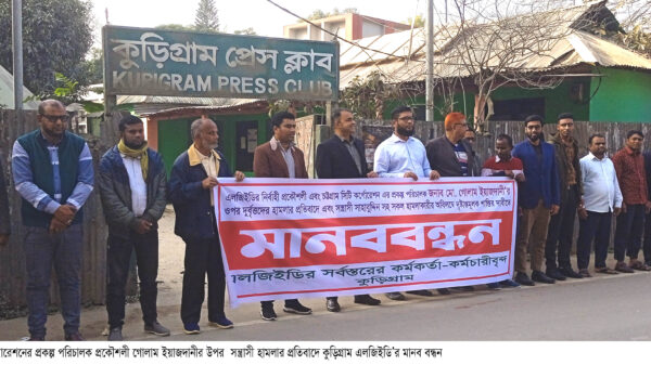 স্থানীয় সরকার প্রকৌশল অধিদপ্তর (এলজিইডি)এর নির্বাহী প্রকৌশলী ও প্রকল্প পরিচালক, চট্টগ্রাম সিটি করপোরেশনের একটি উন্নয়ন প্রকল্পের পরিচালক প্রকৌশলী গোলাম ইয়াজদানীর উপর সন্ত্রাসী হামলার প্রতিবাদে কুড়িগ্রাম এলজিইডি’র মানব বন্ধন অনুষ্ঠিত হয়। সোমবার বিকেলে কুড়িগ্রাম প্রেসক্লাবের সামনে এলজিইডির সর্বস্তরের কর্মকর্তা ও কর্মচারী ঘন্টাব্যাপী মানববন্ধন করেন।