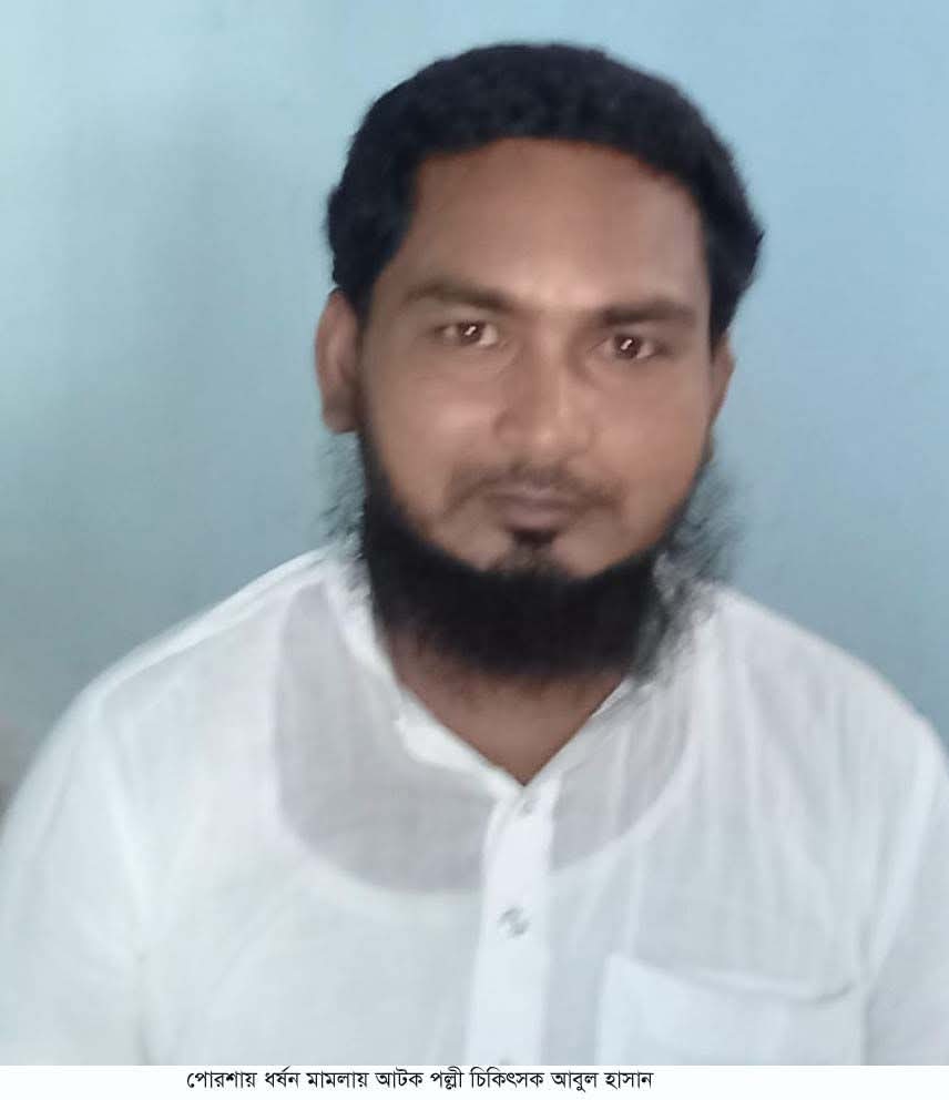 চিকিৎসা সেবাপ্রার্থী এক যুবতীর ধর্ষণ মামলার অভিযোগে আবুল হাসান (৩৪) নামের এক পল্লী চিকিৎসককে গ্রেফতার করেছে থানা পুলিশ। সে নওগাঁর পোরশা উপজেলার তেঁতুলিয়া ইউনিয়নের ঠনঠনিয়াপাড়ার মোসলেম উদ্দিনের ছেলে।
