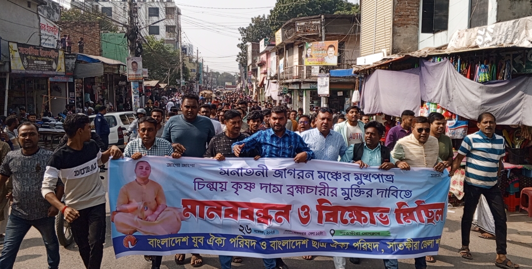 ইসকন নেতা চিন্ময় কৃষ্ণ ব্রহ্মচারী গ্রেপ্তারের প্রতিবাদে সাতক্ষীরায় মানববন্ধন ও বিক্ষোভ মিছিল অনুষ্ঠিত হয়েছে।