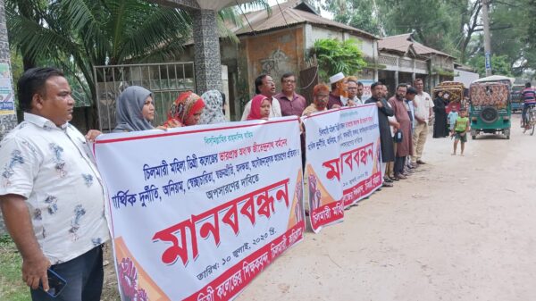 সোমবার বেলা ১১টার দিকে চিলমারীর মাটিকাটা মোড় হতে উপজেলা পরিষদ সড়কে কজেলটির সামনে ঘন্টাব্যাপি এ মানববন্ধন অনুষ্ঠিত হয়।