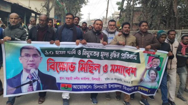 চিলমারী(কুড়িগ্রাম)প্রতিনিধিঃ ১০ দফা দাবি ও বিদ্যুতের মূল্য বৃদ্ধির প্রতিবাদে কুড়িগ্রামের চিলমারীতে উপজেলা বিএনপি বিক্ষোভ মিছিল ও প্রতিবাদ সমাবেশ করেছে। সোমবার বেলা ১১টায় উপজেলা বিএনপি ও যুবদলের আয়োজনে এ বিক্ষোভ মিছিল ও প্রতিবাদ সমাবেশ অনুষ্ঠিত হয়।