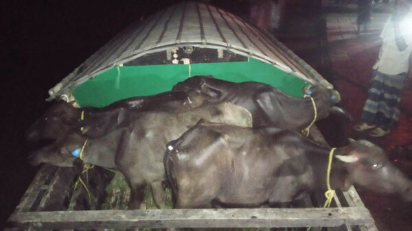 কুড়িগ্রামের চিলমারীতে ব্রহ্মপুত্র নদের পানিতে ৪টি ভারতীয় মহিষ ভেসে এসেছে। এসময় ওই মহিষ গুলোকে নদী থেকে ভাসমান অবস্থায় উদ্ধার করে স্থানীয়রা। তারা ধারণা করছেন ভারত থেকে চোরাচালান কারবারীদের এসব মহিষ ব্রহ্মপুত্রের পানিতে ভেসে এসেছে। ভেসে আসা বেওয়ারিশ মহিষ গুলোকে উদ্ধার করে থানা হেফাজতে রাখা হয়েছে বলে খবর পাওয়া গেছে।