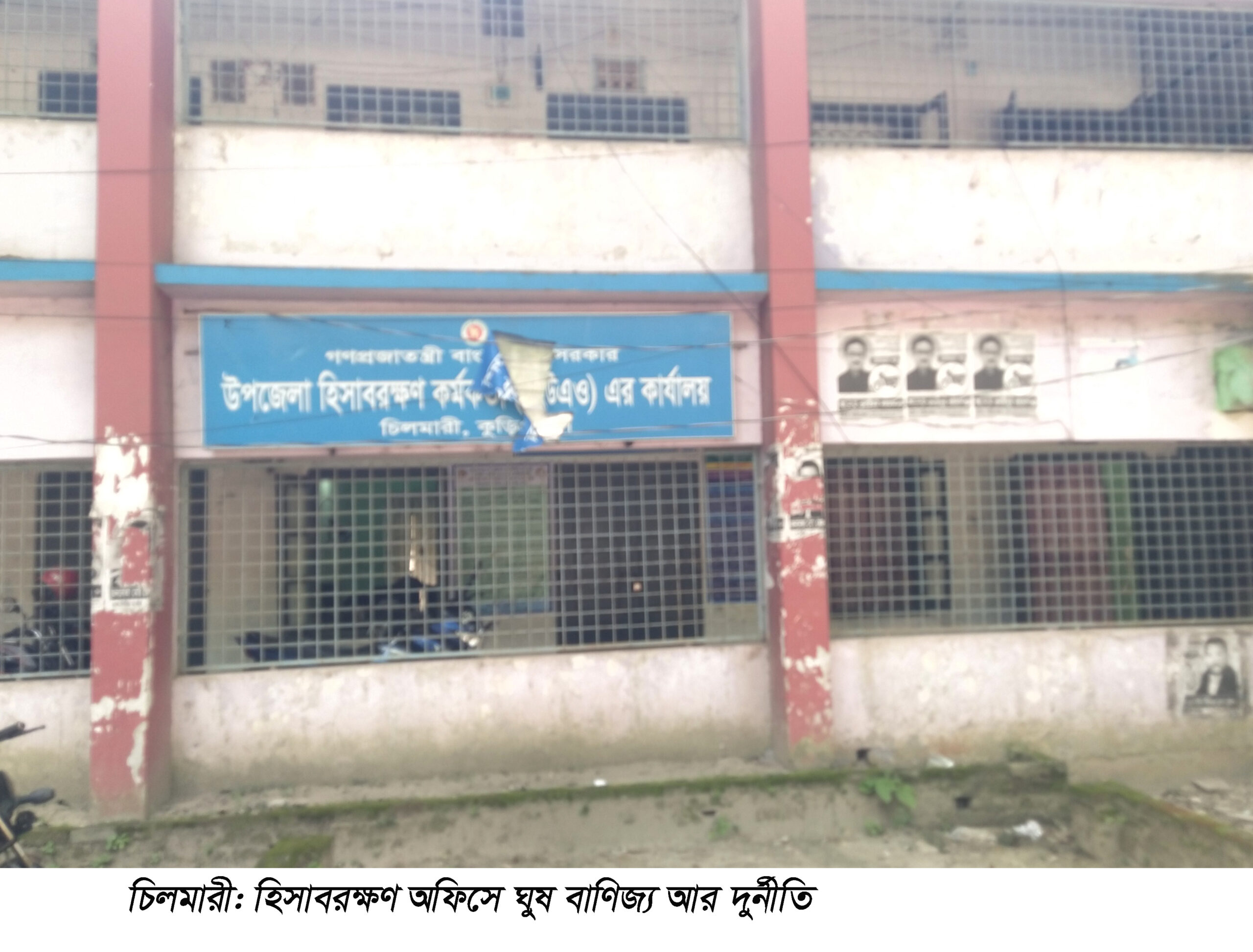 জানা গেছে, কুড়িগ্রামের চিলমারী উপজেলা হিসাব রক্ষণ কার্যালয়টি দীর্ঘদিন থেকে দুর্নীতি ও ঘুষের আখড়ায় পরিনত হয়ে আছে। যেকোন বিল হোক না কেন, পয়সা নেয়া যেন অফিসের দায়িত্বে থাকাদের অধিকারে পরিনত হয়েছে। অফিসের কর্মকর্তা, অডিটরসহ প্রায় সকল স্টাফ যেন অফিসটিকে কমিশন আর ঘুষ নেয়ার অফিস বানিয়ে ফেলেছেন। এই অফিসের দায়িত্বরত কিছু ব্যাক্তিদের বিরুদ্ধেও রয়েছে বিলের পারসেন বা কমিশনের বানিজ্য। জিপিএফ হিসাব নম্বর খোলা, বেতন নির্ধারণ, বকেয়া বিল, জিপিএ চূড়ান্ত বিলসহ কোনোকিছুই মোটা অঙ্কের উৎকোচ ছাড়া পাশ হয় না এমন অভিযোগ সেবা নিতে আসা ব্যাক্তিদের। বিলের সাথে কমিশন বা পারসেন বেঁধে দেওয়া আছে এমন মন্তব্য করে নাম প্রকাশ না করার শর্তে বিভিন্ন দপ্তরের কর্মকর্তা বলেন, অফিস গুলোর বিভিন্ন বিল পাশ করতে গেলে আমাদের বিলের ২% থেকে ৫% টাকা হিসাব রক্ষণ অফিসে দিতে হবে, আর এই পারসেন যত দ্রুত দেয়া হবে কাজ দ্রুত হবে, আর না হলে ঘুরতে ঘুরতে সময়ও যাবে আবার কমিশনও দিতে হবে। আমরা তো সেবা দিতে টাকা নেই না, এমন মন্তব্য করে হাসপাতালের কয়েকজন স্টাফ বলেন, হিসাবরক্ষণ অফিসের কাজ গুলো করতে গেলে টাকা না দিলে তা হবে না, টাকা দিতেই হবে। এসময় তারা আরো জানান, সরকার তো তাদের বেতন ভাতা দেন সেবা দেয়ার জন্য, তাহলে কেন কাজ করতে আবার তাদের ঘুষ দিতে হবে। টাকা না দেয়ার কারনে তিনমাস ঘুরে কাজ হয়েছে জানিয়ে একজন কলেজ শিক্ষক বলেন, সেটিও আবার কিছু গন্যমান্য ব্যাক্তি আর মিডিয়ার ব্যক্তিদের সুপারিশে। কমিশন বা ঘুষ না দিলে বা অভিযোগ করলে পরবর্তিতে বিভিন্ন ভাবে হুমকিসহ হয়রানী করা হয় বলেও ভুক্তভুগিরা নিরবে দুর্নীতিকে মেনে নিয়েই ঘুষ দিয়ে চলছেন বলে মন্তব্য করেন হয়রানীর স্বীকার ব্যাক্তিরা। এছাড়াও অভিযোগ রয়েছে প্রায় বিল গুলো পাশের জন্য মোটা অঙ্কের উৎকোচ ছাড়া পাশ হয় না এবং নড়ে না ফাইল। প্রাথমিক শিক্ষক শাহজাহান আলী বলেন, পিআরএল এবং অবসরের কাজ করতে গিয়ে তাকে টাকা দিতে হয়েছে এছাড়াও হয়রানী তো আছেই। কাজ করতে গিয়ে তাকেও ৩হাজার টাকা দিতে হয়েছে জানিয়ে শিক্ষক হারুন অর রশিদ বলেন, বাহে হামরা কইলাম অফিসের লোকজন আবার হামার সমস্যা যদি করে। সমস্যা করতে পারে এবং কাগজ ঠিক থাকলেও তা কৌশলে সমস্যা সৃষ্টি করে হয়রানী হওয়ার ভয়ে শতশত ভুক্তভুগিরা মুখ খুলতে ভয় করেন জানিয়ে বিভিন্ন ভাতাভুগিসহ অনেকে জানান, যারা ঐ অফিসে কাজের জন্য যায় প্রায় সকলেই খরচ দিতে হয় এটাও সবার জানা আছে । হয়রানীর শিকার ফাহমিদুল নামে এক যুবক বলেন, এই অফিসের তার বাবা ও মায়ের কাজ করতে গিয়ে একাধিকবার ঘুষ দিতে হয়েছে এবং ঘুরতেও হয়েছে। কলেজ শিক্ষক নিজামুল ইসলাম বলেন, ট্রেজারী (হিসাবরক্ষণ) অফিসে একটি কাজ করতে গিয়ে হয়রানী শিক