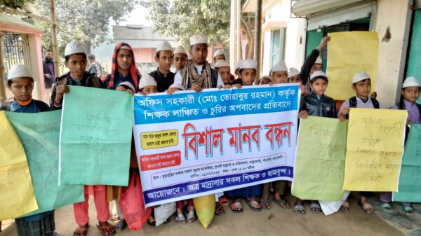জয়পুরহাটের পাঁচবিবির নাকুড়গাছি বুড়াবুড়ীর মাজার দুরুসসুন্নাহ হাফেজিয়া ক্বওমী মাদ্রসা লিল্লাহ বোর্ডিং ও এতিমখানায় শিক্ষক হাফেজ আবু শাহিদ ও শিক্ষার্থীদের বিভিন্ন ভাবে লাঞ্ছিত ও মিথ্যা চুরির অপবাদ দিয়ে আসতেছিল ওই প্রতিষ্ঠান সাধারণ সম্পাদক ও অফিস সহকারীর তোয়াবুর মন্ডল। একপর্যায়ে শিক্ষক ও শিক্ষার্থীরা প্রতিষ্ঠানের সাধারণ সম্পাদক ও অফিস সহকারীকে প্রত্যাহারের দাবিতে মানববন্ধন করেছে ৪ জন শিক্ষক ও ৪০ জন শিক্ষার্থীরা।