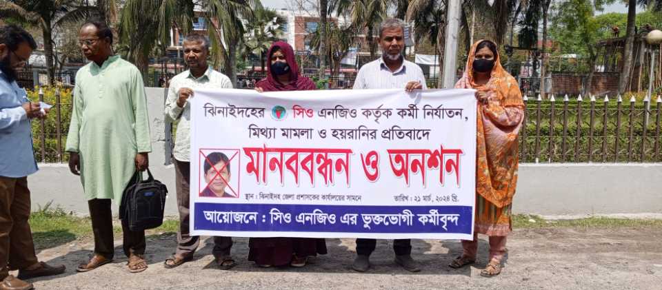 কর্মী নির্যাতন,মিথ্যা মামলা ও হয়রানির প্রতিবাদে ঝিনাইদহের সিও এনজিও’র বিপক্ষে এক মানব বন্ধন কর্মসূচী করেছে উক্ত এনজিও’র ভুক্তভোগী কর্মীরা।