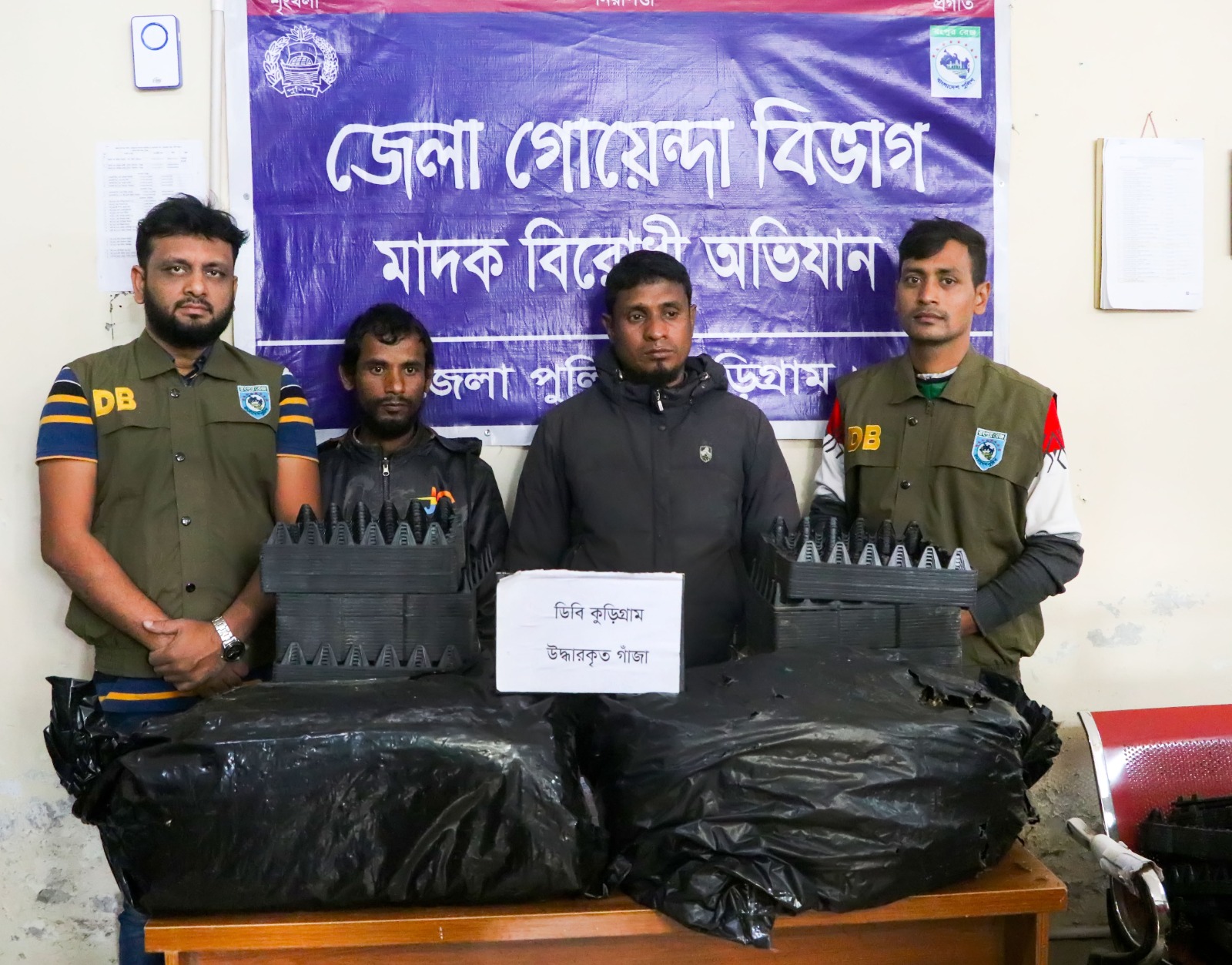 জেলা পুলিশ জানায়, কুড়িগ্রাম জেলা পুলিশের গোয়েন্দা শাখা (ডিবি) এর একটি টিম মঙ্গলবার (২৮ নভেম্বর) দিবাগত রাত ১টা ৪৫ মিনিটে জেলা সদরের ধরলা ব্রীজ সংলগ্ন এলাকায় অভিযান চালায়। এসময় ওই এলাকা থেকে অভিনব কায়দায় ডিমের খাঁচা কেটে ফিটিং করা ২১ কেজি ২০০ গ্রাম গাঁজাসহ ফুলবাড়ী উপজেলার বেড়াকুটি এলাকার মাদক কারবারি জাহিদুল ইসলাম ও নাগেশ্বরীর উপজেলার মাদক কারবারি আনিসকে গ্রেফতার করে।