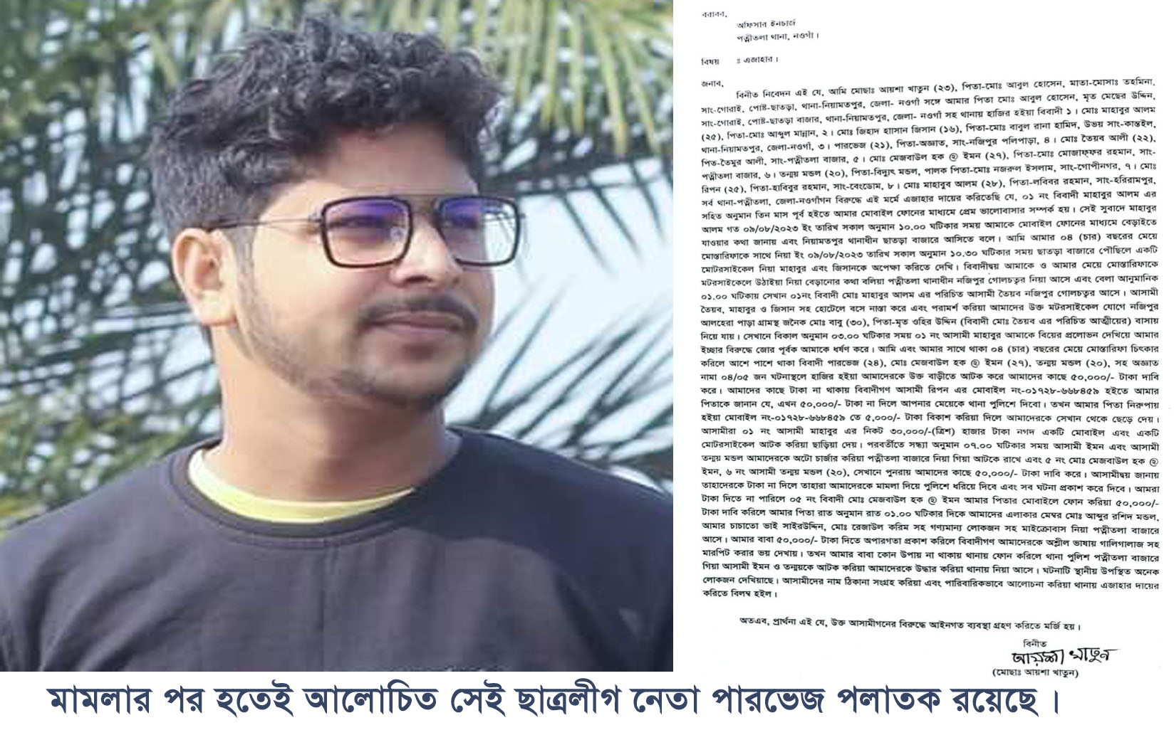 সেখানে বাদীকে বিয়ের প্রলোভন দেখিয়ে বিবাদী মাহবুর ধর্ষণ করে। পরে ঘটনাটি ধামাচাপা দিতে ওই তরুণীকে ভয়ভীতি প্রদর্শন পূর্বক বিবাদী ছাত্রলীগ নেতা পারভেজ ৫০ হাজার টাকা চাঁদা দাবি করে ও ভুক্তভোগী তরুণীর বাবা বিকাশে (০১৭২৮-৬৬৮৪৫৯) নম্বরে পাঁচ হাজার টাকা প্রদান করেন। এছাড়াও ১ নম্বর আসামীর নিকট হতে নগদ ত্রিশ হাজার টাকা ও একটি মোটরসাইকেল জব্দ করে সেখান থেকে ছেড়ে দেয়। পরবর্তীতে অন্য বিবাগীগণ আবারো পত্নীতলা বাজার এলাকায় গভীর রাতে ভুক্তভোগীকে আটক রেখে পুনরায় ৫০ হাজার টাকা চাঁদা দাবী করেন।