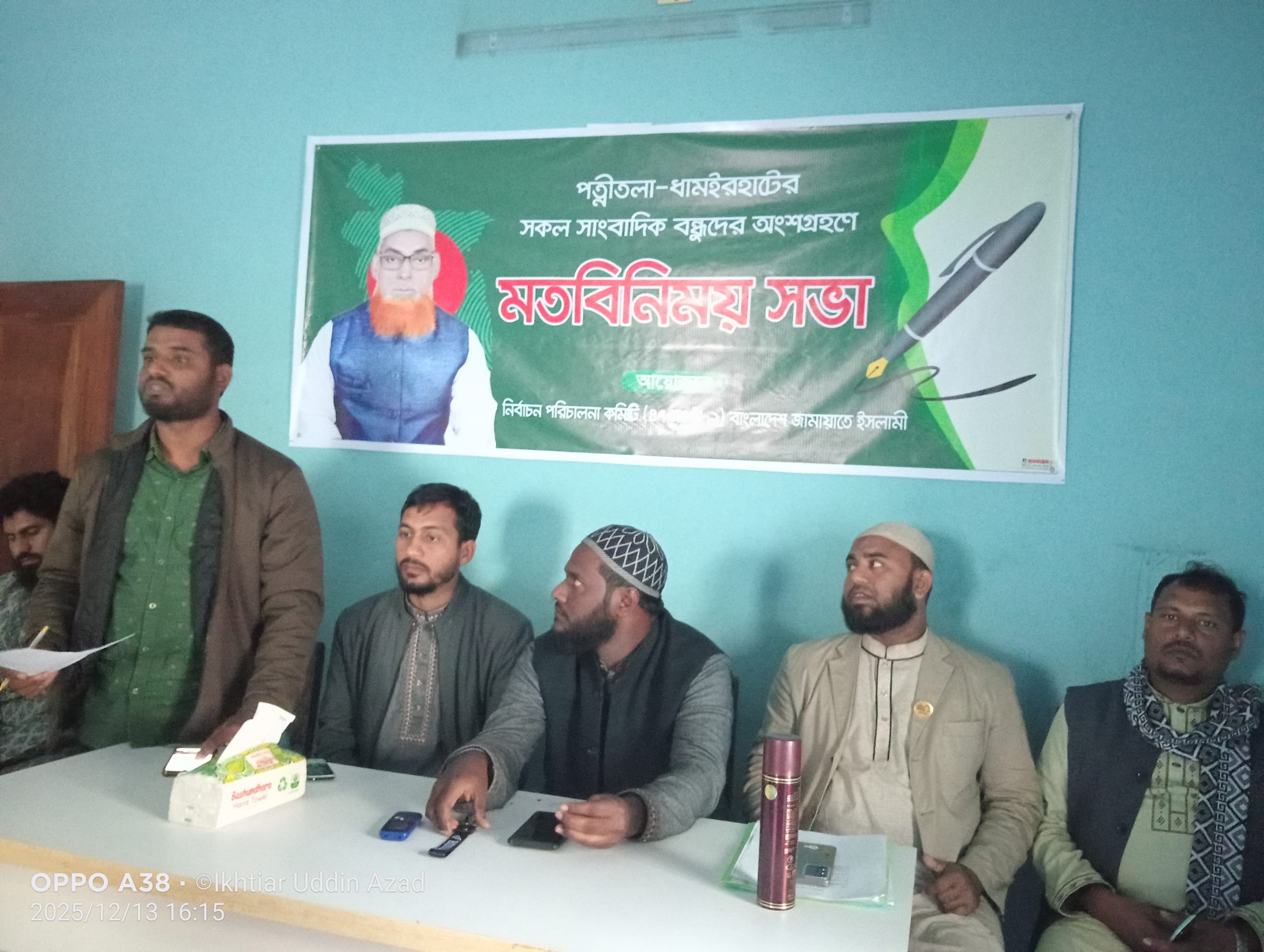 নওগাঁর পত্নীতলায় বাংলাদেশ জামায়াতে ইসলামীর নওগাঁ–২ (পত্নীতলা-ধামইরহাট) আসন পরিচালনা কমিটির উদ্যোগে স্থানীয় সাংবাদিকদের সঙ্গে মতবিনিময় সভা অনুষ্ঠিত হয়েছে।