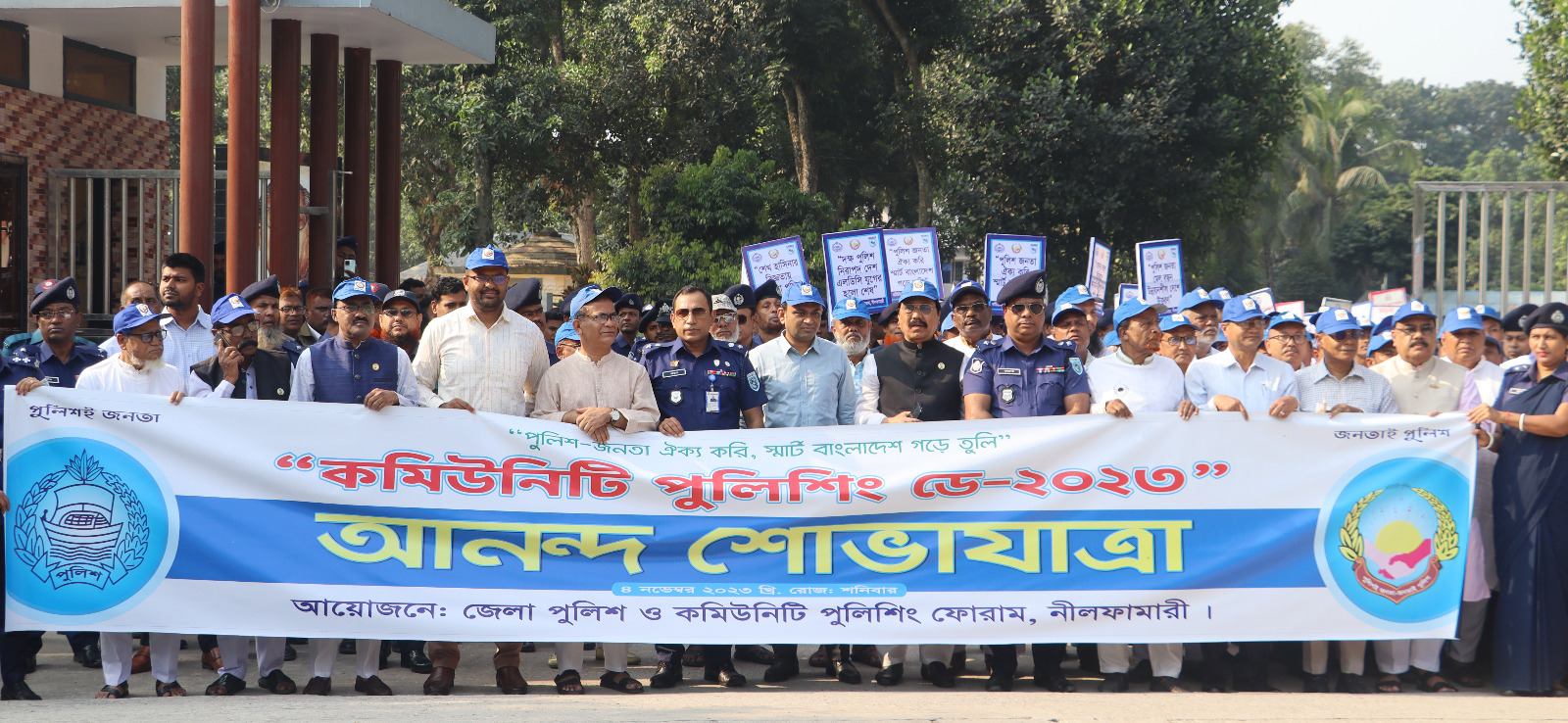 মোঃ মাসুদ রানা, স্টাফ রিপোর্টার: আজ শনিবার (০৪ নভেম্বর ২০২৩ খ্রিষ্টাব্দ) “পুলিশ জনতা ঐক্য করি স্মার্ট বাংলাদেশ গড়ে তুল” এই প্রতিপাদ্যকে সামনে রেখে জেলা পুলিশ ও কমিউনিটি পুলিশিং ফোরাম নীলফামারীর আয়োজনে ‘কমিউনিটি পুলিশিং ডে-২০২৩’ উদযাপন উপলক্ষে বর্ণাঢ্য আনন্দ শোভাযাত্রা, আলোচনা সভা ও পুরস্কার বিতরণী অনুষ্ঠান অনুষ্ঠিত হয়।