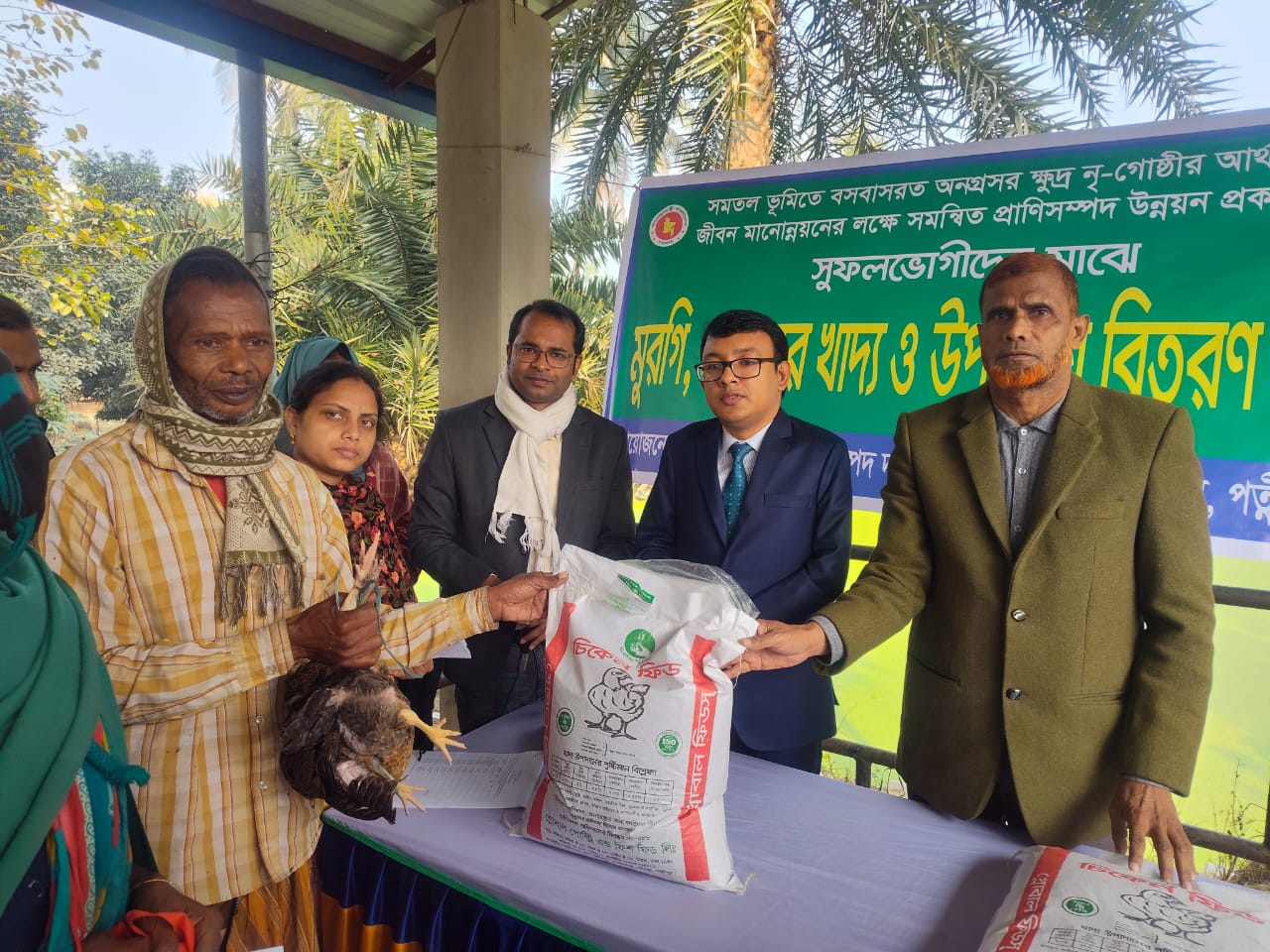 নওগাঁর পত্নীতলায় জীবনের মানোন্নায়নে সমতল ভূমিতে বসবাসরত ক্ষুদ্র নৃগোষ্ঠীর মাঝে দেশী মুরগি, খাদ্য ও ঔষুধ বিতরণ অনুষ্ঠিত হয়েছে।