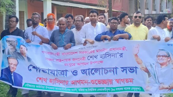জহির রায়হান কাউনিয়া( রংপুর) প্রতিনিধিঃ রংপুরের কাউনিয়া উপজেলা আওয়ামী লীগের ত্যাগি,বঞ্চিত ও নির্যাতিত নেতা (৯০ দশকের সাবেক নেতৃবৃন্দ) উদ্যোগে প্রধানমন্ত্রী শেখ হাসিনা’র রংপুর আগমন উপলক্ষে এক শোভা যাত্রা ও আলোচনা সভা কাউনিয়া বাস স্টান্ডে অনুষ্ঠিত হয়েছে। বৃহস্পতিবার বিকেলে ৯০ দশকের সাবেক নেতৃবৃন্দের ব্যানারে কাউনিয়া বালিকা বিদ্যালয় থেকে একটি শোভাযাত্রা বের করে উপজেলার প্রধান প্রধান সড়ক প্রদক্ষিণ করে আর কে রোড বাস স্টান্ড বীর মুক্তিযোদ্ধা এমএ কুদ্দুস স্মরনীতে আলোচনা সভায় মিলিত হয়। এসময় বক্তব্য রাখেন,উপজেলা পরিষদ ভাইস চেয়ারম্যান ও জেলা আওয়ামী লীগের আহ্বায়ক কমিটির সদস্য আব্দুর রাজ্জাক,উপজেলা আওয়ামী লীগ সহ-সভাপতি সাইফুল ইসলাম,উপজেলা আওয়ামীলীগ সদস্য হাবিবুর রহমান, ৯০ দশক আওয়ামীলীগের মুখপাত্র আশরাফুল ইসলাম,কুর্শা ইউনিয়ন পরিষদের চেয়ারম্যান ও জেলা স্বেচ্ছাসেক লীগের সদস্য আব্দুল মজিদ, টেপামধুপুর ইউনিয়ন পরিষদের চেয়ারম্যান রাশেদুল ইসলাম, হারাগাছ ইউনিয়ন পরিষদের চেয়ারম্যান রাজু আহমেদ, বালাপাড়া ইউনিয়ন আওয়ামীলীগের সাবেক সাধারন সম্পাদক দিলদার আলী, যুবলীগ নেতা ইউসুফ আলী, উপজেলা আওয়ামীলীগের সাবেক আইন বিষয়ক সম্পাদক আবু ফেরদৌস মোঃ মহসিন হীরা সরকার, উপজেলা যুব মহিলা লীগের সভাপতি হাসনা পারভীন মুক্তি, যুবলীগ নেতা আব্দুল লতিফ, উপজেলা ছাত্রলীগের সাবেক সভাপতি সুশান্ত কুমার, তৌফিকুল ইসলাম রানা প্রমূখ। এসময় দীর্ঘ প্রায় এক যুগ পরে রংপুরে প্রধানমন্ত্রী শেখ হাসিনা’র আগমনে স্বাগত জানানো হয়।