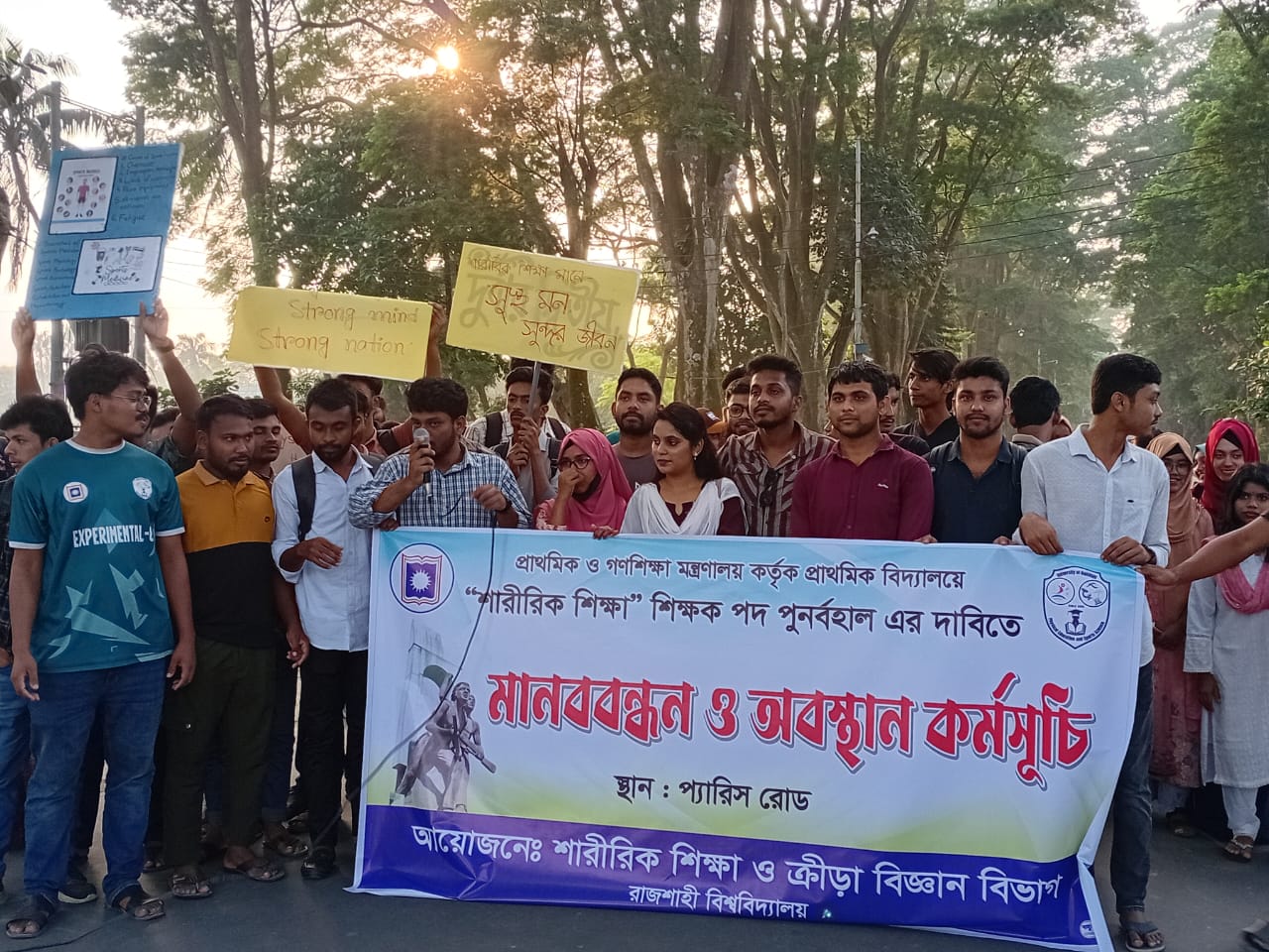 প্রাথমিক শিক্ষা পর্যায়ে শারীরিক শিক্ষা শিক্ষক পদ পুনর্বহাল এর দাবিতে মানববন্ধন ও অবস্থান কর্মসূচি পালন করেছেন রাজশাহী বিশ্ববিদ্যালয়ের (রাবি) শারীরিক শিক্ষা ও ক্রীড়া বিজ্ঞান বিভাগের শিক্ষার্থীরা।