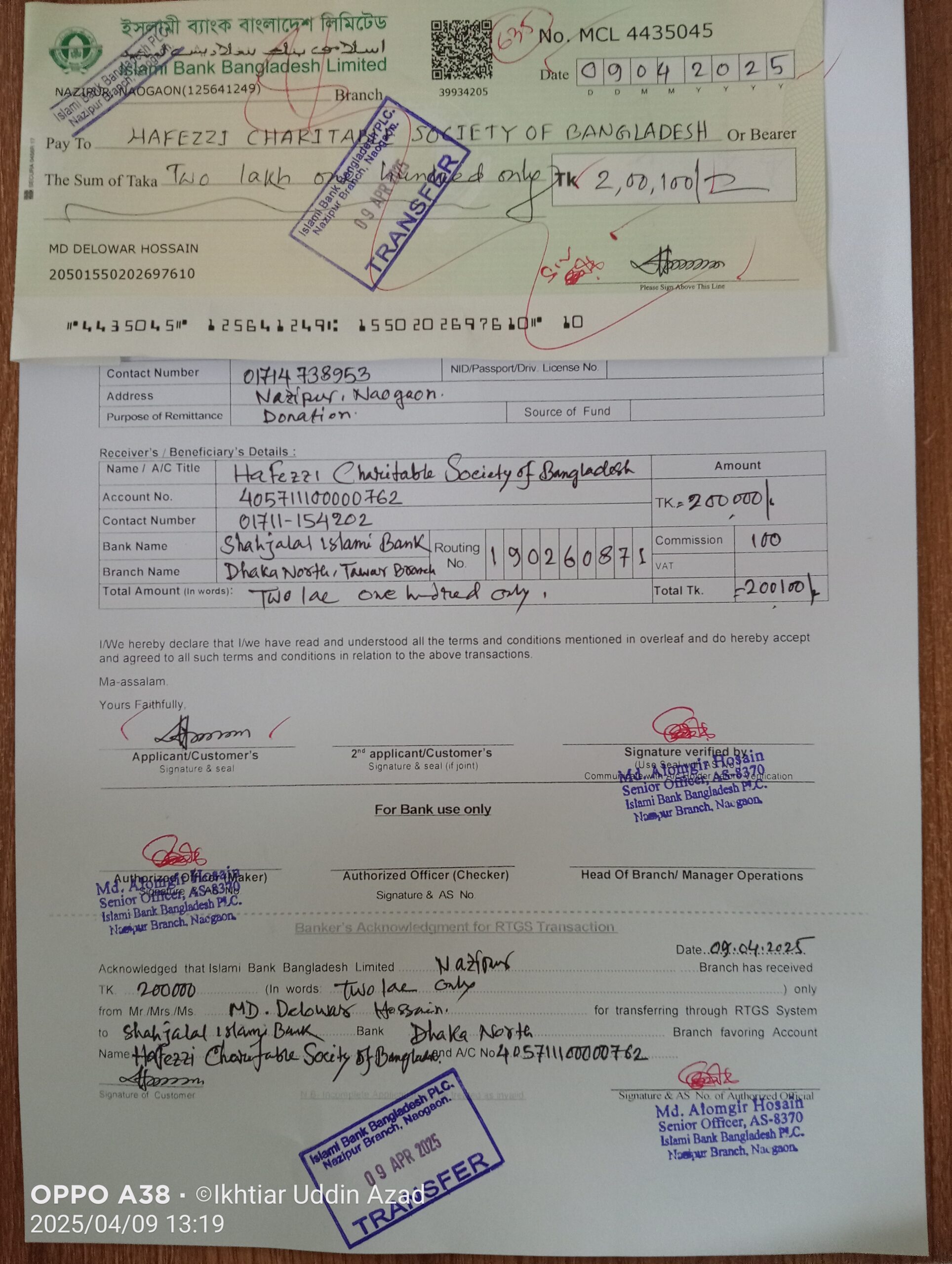 বুধবার (৯ এপ্রিল) দুপুরে উপজেলার ইসলামী ব্যাংক বাংলাদেশ পিএলসি ব্যাংকের নজিপুর শাখা থেকে উল্লেখিত সাহায্য হাফেজি চ্যারিট্যবল সোসাইটি অব বাংলাদেশ ফান্ডে প্রেরণ করা হয়েছে। মুক্তিকামী তৌহীদি জনতার পক্ষে প্রভাষক দেলোয়ার হোসেন বলেন, ‘প্রথম পর্যায়ে আমরা জনগণের সংগ্রহকৃত দুই লাখ টাকা সাহায্য উত্তোলন করি। মজলুম আহুত ফিলিস্তিনের পাশে দাঁড়িয়ে আমাদের সাহায্য চলমান থাকবে। -ইনশাআল্লাহ্।’