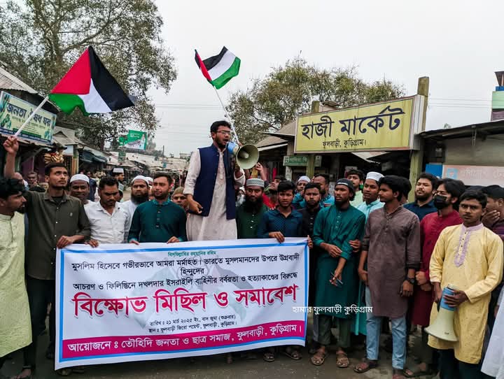 ফিলিস্তিনে ইসরাইলি দখলদার বাহিনীর বর্বরতা হত্যাকাণ্ড ও ভারতীয় মুসলমানদের উপর উগ্রবাদী হিন্দুদের হামলার প্রতিবাদে কুড়িগ্রামের ফুলবাড়ীতে তৌহিদী জনতা ও ছাত্র সমাজের বিক্ষোভ মিছিল ও পথসভা অনুষ্ঠিত হয়েছে।