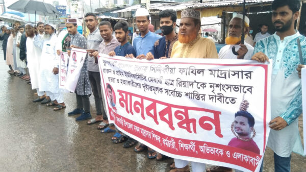 দিনাজপুরের ফুলবাড়ী দারুস সুন্নাহ্ সিদ্দিকিয়া ফাযিল মাদ্রাসার প্রাক্তন ও ঢাকা প্রাইম ইউনিভারর্সিটির মেধাবী শিক্ষার্থী রিয়াদ হোসেন(২১) কে নৃশংসভাবে হত্যা ও হত্যাকারীদের দৃষ্টান্তমূলক সর্বোচ্চ শান্তির দাবীতে মাবনবন্ধন অনুষ্ঠিত হয়েছে।