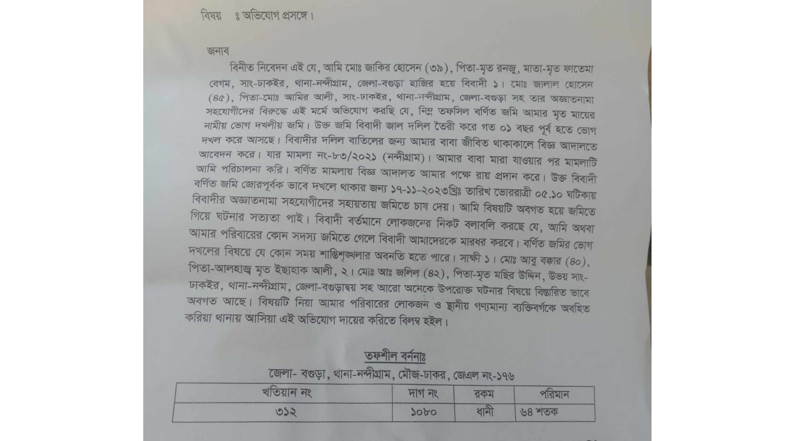 অভিযোগ সূত্রে জানা গেছে, ভুক্তভোগী জাকির হোসেনের মৃত মায়ের নামীয় ১০৮০ দাগের ৬৮ শতক জমি একই গ্রামের প্রভাবশালী জালাল হোসেন ১ বছর পূর্বে জাল দলিল তৈরি করে জোর করে ভোগ দখল শুরু করেন। উক্ত জাল দলিল বাতিলের দাবীতে জাকির হোসেনের পিতা বিজ্ঞ আদালতে মামলা নং ৮৩/২০২১ দায়ের করেন। দু-পক্ষের শুনানীর পর বিজ্ঞ আদালত ভুক্তভোগী জাকির হোসেনের পক্ষে রায় প্রদান করেন। অথচ অভিযুক্ত জালাল হোসেন উক্ত জমি জোর পূর্বক দখলে থাকার জন্য রাতের আধারে অজ্ঞাত ব্যক্তিদের সহযোগীতায় হালচাষ করেন। খবর পেয়ে জাকির হোসেন ঘটনাস্থলে গিয়ে ঘটনার সত্যতা পেয়ে থানায় লিখিত অভিযোগ দায়ের করেন।
