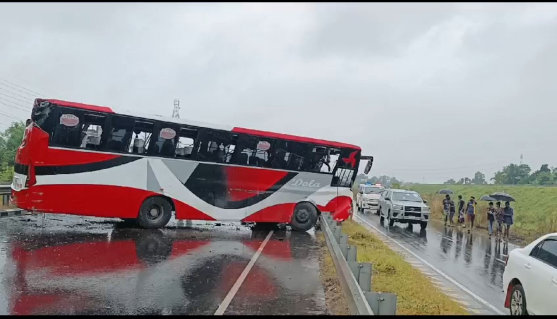 দোলা পরিবহনের যাত্রীবাহী একটি বাস নিয়ন্ত্রণ হারিয়ে সড়কের আইল্যান্ডে ধাক্কা লাগলে ওই দূর্ঘটনা ঘটে। নিহত মাসুদ রানা (৪৫), দুর্ঘটনা কবলিত দোলা পরিবহনের সুপারভাইজার ও নিহত অপর অজ্ঞাতনামা পুরুষ (৪৫) এর নাম পরিচয় জানা যায়নি।