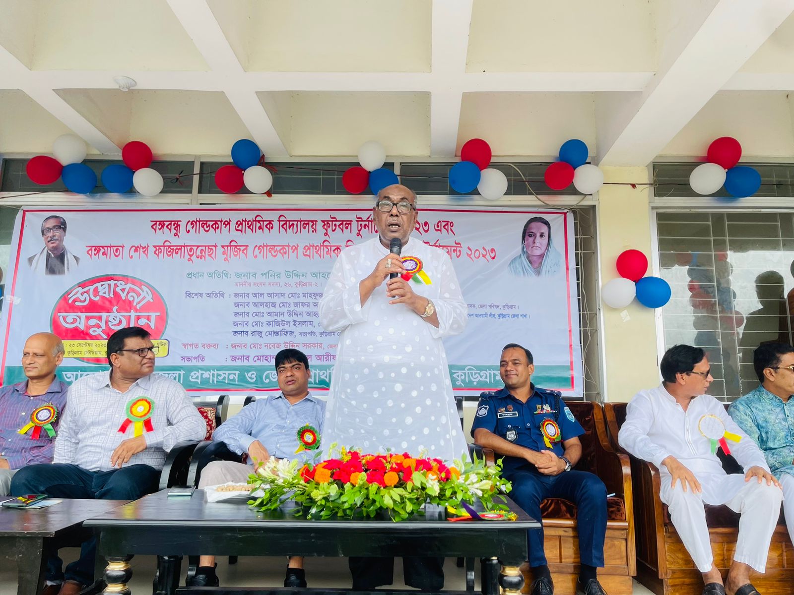 বঙ্গবন্ধু গোল্ডকাপ প্রাথমিক বিদ্যালয় ও বঙ্গমাতা শেখ ফজিলাতুন্নেছা মুজিব গোল্ডকাপ প্রাথমিক বিদ্যালয় ফুটবল টুর্নামেন্ট -২০২৩ শনিবার সকালে কুড়িগ্রাম ষ্টেডিয়ামে উদ্ধোধন করা হয়। অনুষ্ঠানে প্রধান অতিথি ছিলেন কুড়িগ্রাম -২ আসনের সংসদ সদস্য পনির উদ্দিন আহমেদ। বিশেষ অতিথি ছিলেন পুলিশ সুপার মোঃ আল আসাদ মেঃ মাহফুজুল ইসলাম,জেলা আওয়ামীলীগের সভাপতি ও জেলা পরিষদের চেয়ারম্যান মোঃ জাফর আলী,জেলা আওয়ামীলীগের সম্পাদক ও উপজেলা চেযারম্যান আমান উদ্দিন আহমেদ মনজু,পৌর মেযর কাজিউল ইসলাম,কুড়িগ্রাম প্রেস ক্লাবের সভাপতি রাজু মোস্তাফিজ। সভাপতিত্ব করেন জেলা প্রশাসক মোহাম্মদ সাইদুল আরীফ। স্বাগত বক্তব্য দেন জেলা প্রাথমিক শিক্ষা কর্মকর্তা মোঃ নবেজ উদ্দিন সরকার।