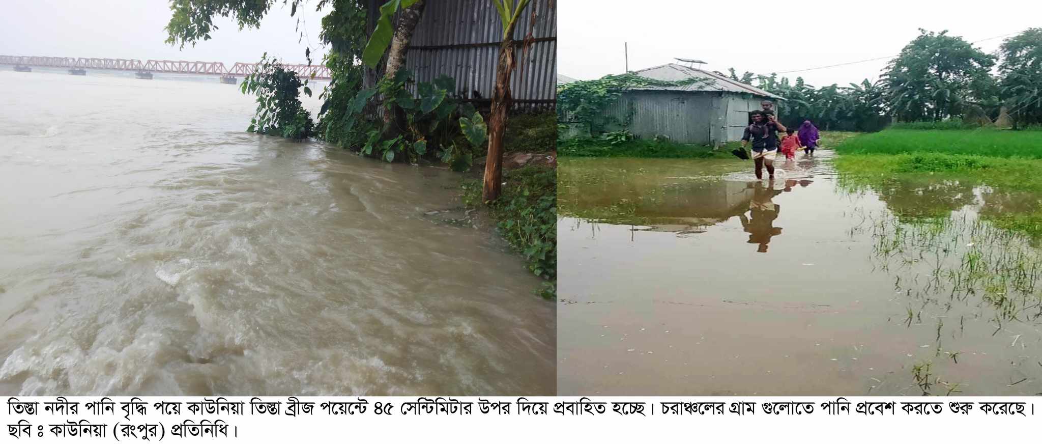 সরেজমিনে গিয়ে দেখা গেছে উজানের ঢলে শনিবার সকাল থেকে তিস্তায় পানি বৃদ্ধি পেতে থাকে। এতে করে তিস্তা ব্যারেজের ভাটিতে অবস্থিত কাউনিয়া উপজেলার বেশ কয়েক টি তিস্তার চর এলাকায় পানি প্রবেশ করে, তার মধ্যে ঢুষমারা, পূর্ব নিজপাড়া, তালুক শাহবাজের অংশ, গোপীডাঙ্গা,আরাজি হরিশ্বর, প্রাননাধ, আজম খাঁ,চর গনাই,হয়বতখাঁ ঢুসমারা চর এলাকায় প্রায় ১০০শ’ বাড়ীঘর পানিতে তলিয়ে গেছে। এতে করে আমন ধানের ক্ষেত ও বীজ তলা পানিতে ডুবে যায়। বিস্তীর্ণ চরের দুই হাজার একর জমির ফসল পানিতে ডুবে গেছে। ফলে দুশ্চিন্তায় পড়েছেন চরাঞ্চলের কৃষকরা।