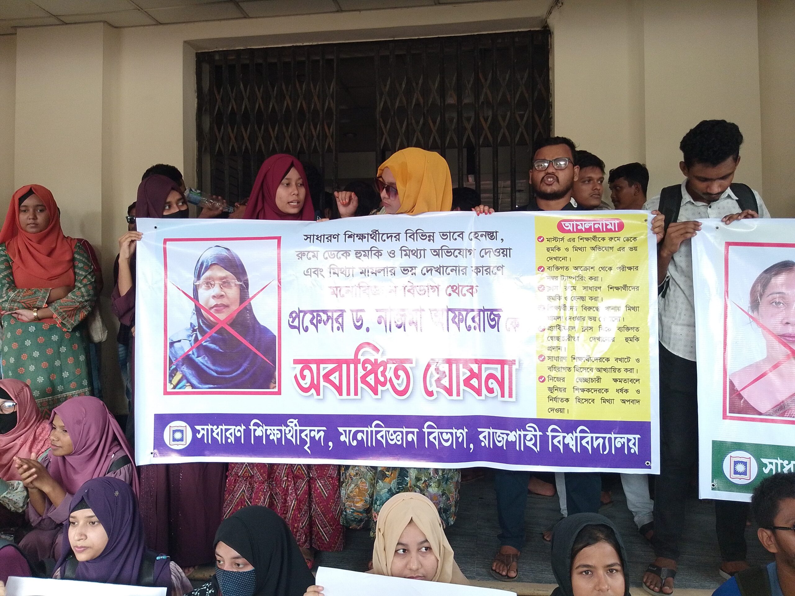 রাজশাহী বিশ্ববিদ্যালয়ের (রাবি) মনোবিজ্ঞান বিভাগের ২ শিক্ষিকাকে অব্যাহতি প্রদানের দাবিতে অবস্থান কর্মসূচি পালন করে বিভাগের শিক্ষার্থীরা।তারা উপাচার্য বরাবর ৫ দফা দাবি উথাপন করেন।বৃহস্পতিবার (১৯ সেপ্টেম্বর) প্রশাসনিক ভবনের সামনে এই কর্মসূচি পালন করেন তারা। এ সময় তারা ৫ দফা দাবি তুলে ধরেন।