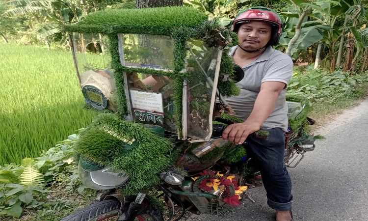 সবুজ গাছপালার প্রতি যত ভালবাসা এক যুবকের। ব্যতিক্রম উদ্যোগে গাছের প্রতি নিজের ভালবাসা প্রকাশ করেছেন বৃক্ষপ্রেমী রং মিস্ত্রি হাবিবুর রহমান হাবিব। নিজের চালানো মোটরসাইকেল সাজিয়েছেন নানা প্রজাতির গাছ দিয়ে। রাস্তা দিয়ে চলাচল করার সময় সবাই তাক লাগিয়ে দেখেন। যেন এটি মোটরসাইকেল নয়, যেন সবুজ গাছপালার বাগান।