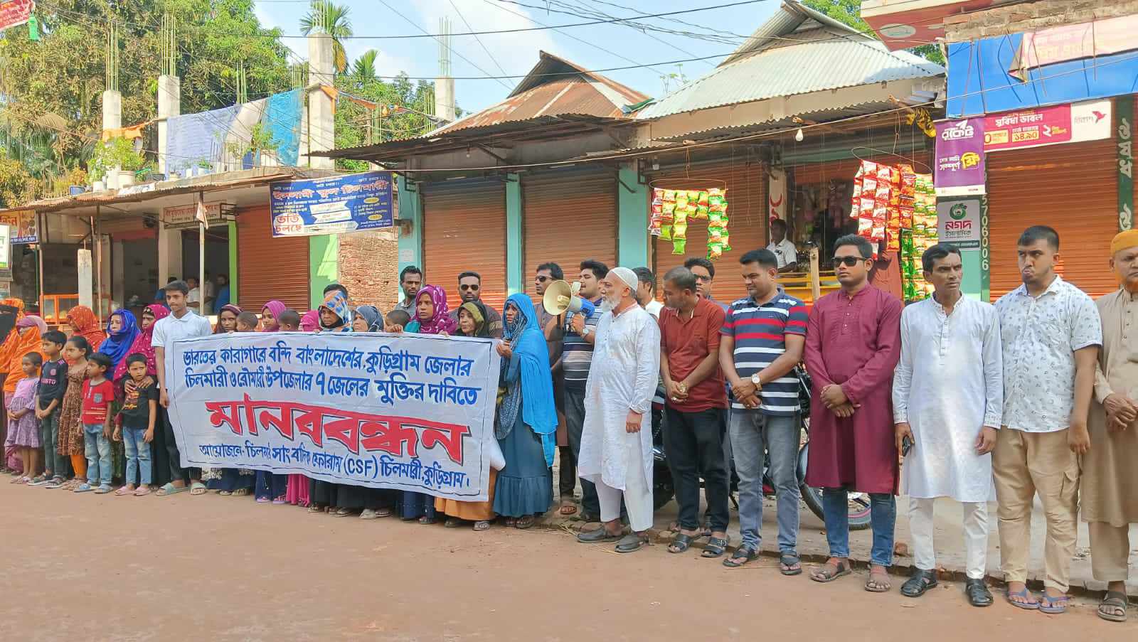 ভারতের কারাগারে আটক ৭ জেলের মুক্তির দাবিতে চিলমারীতে মানববন্ধন