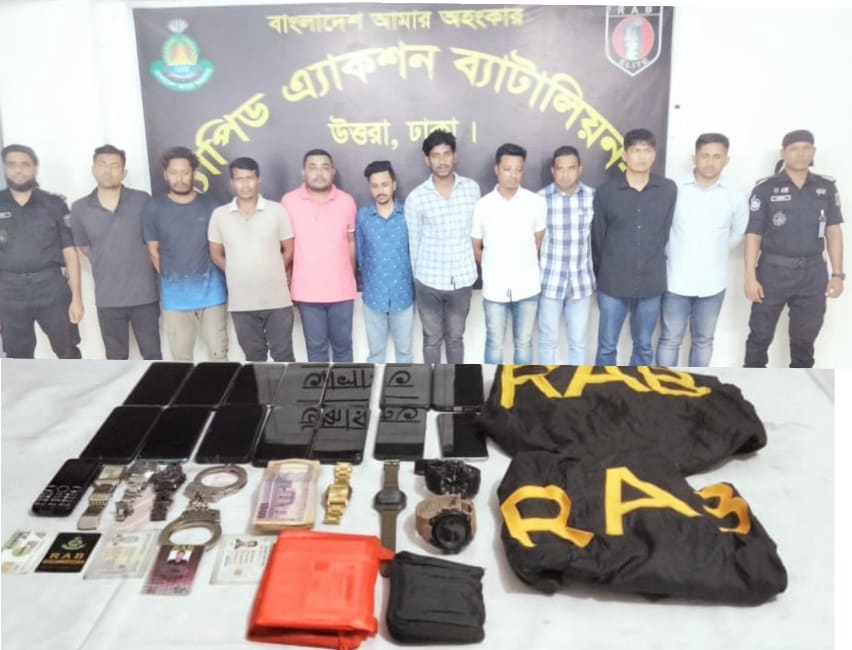 র্যাব-১ এর সদস্য” পরিচয়ে র্যাবের জ্যাকেট পরিধান ও র্যাব-১ ছদ্মবেশ ধারণ করে র্যাবের ভয়ভীতি প্রদর্শন করে বিভিন্ন বিত্তশালী ব্যক্তির নিকট হতে টাকা-পয়সা ইত্যাদি আদায়সহ উত্তরা এলাকায় অবস্থান করছে।