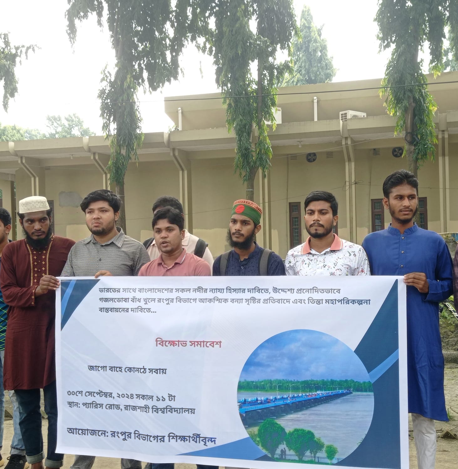 সোমবার (৩০সেপ্টেম্বর) সকাল ১১টায় রাজশাহী বিশ্ববিদ্যালয়ে (রাবি) প্যারিস রোডে রংপুর বিভাগের শিক্ষার্থীদের ব্যানারে উদ্দেশ্য প্রনোদিতভাবে গজলডোভা বাধ খুলে রংপুর বিভাগে আকস্মিক বন্যার সৃষ্টি এবং তিস্তা মহাপরিকল্পনা বাস্তবায়নের দাবিতে বিক্ষোভ সমাবেশে তিনি এসব কথা বলেন।