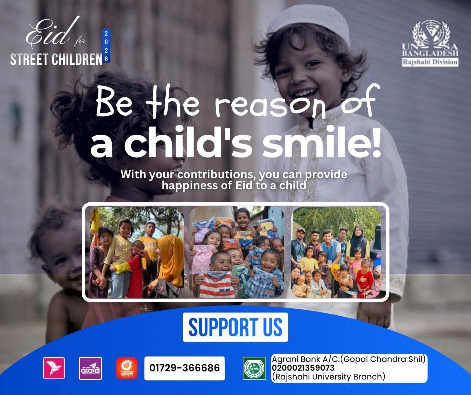 এই শিশুদের মাঝে সমানভাবে ঈদের আনন্দ ছড়িয়ে দিতে মানবিক উদ্যোগ নিয়েছে United Nations Youth and Students Association of Bangladesh (ইউনিস্যাব)–এর রাজশাহী ডিভিশন। তাদের আয়োজনে অনুষ্ঠিত হতে যাচ্ছে ‘ঈদ ফর স্ট্রিট চিলড্রেন ২০২৬’ শীর্ষক বিশেষ কর্মসূচি।